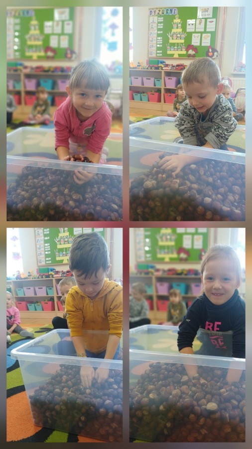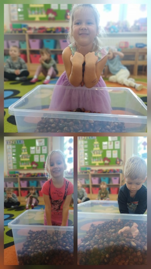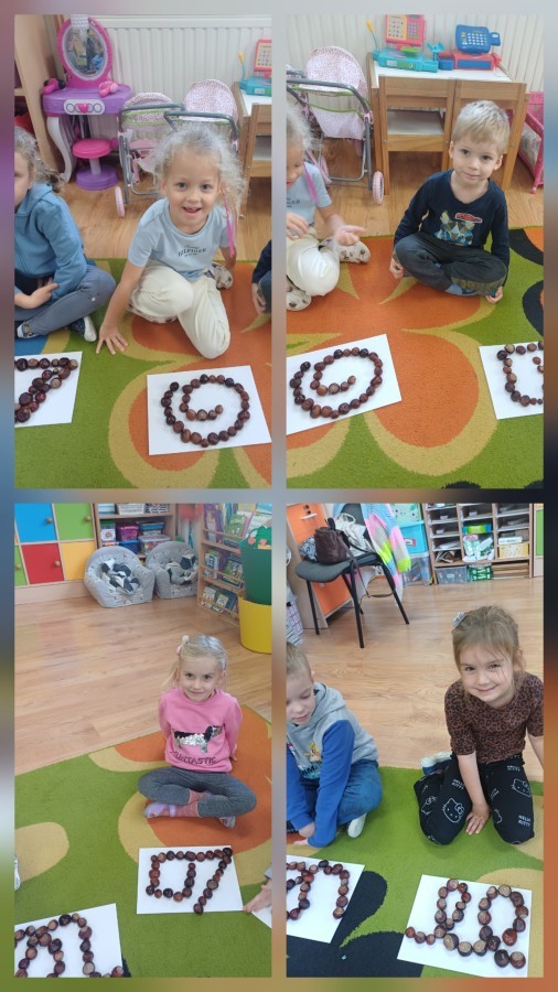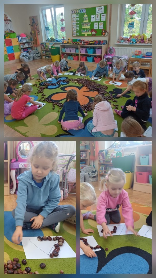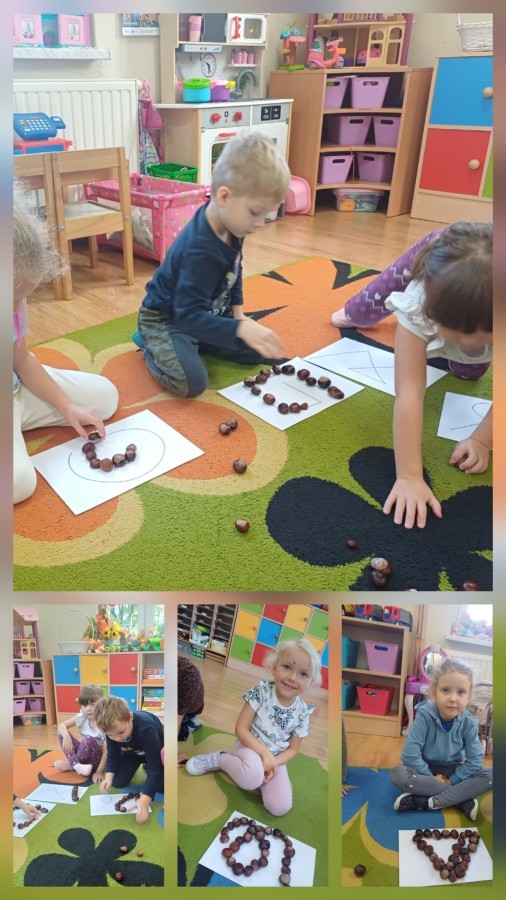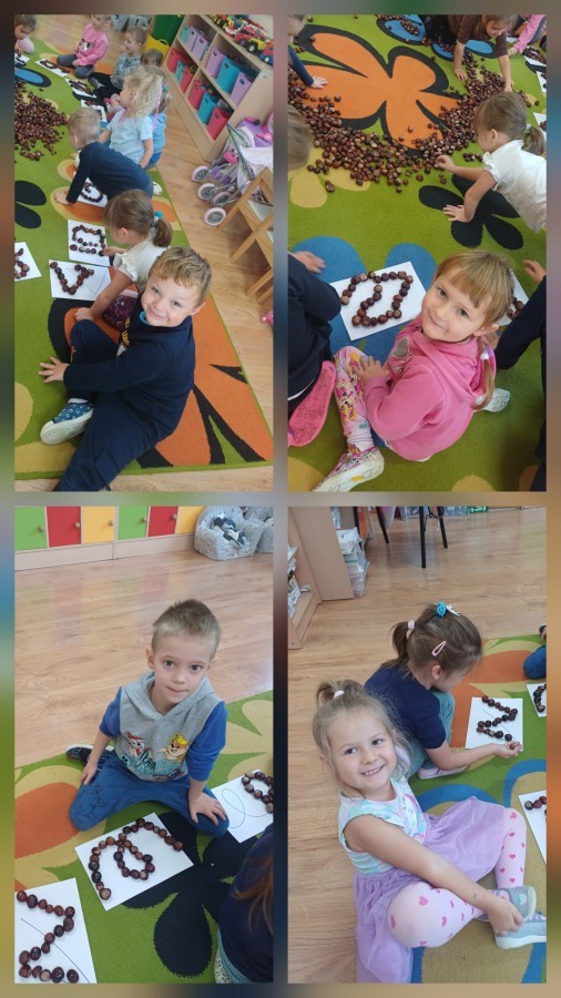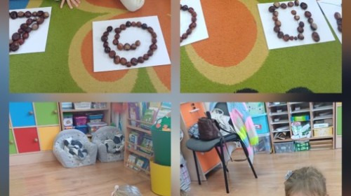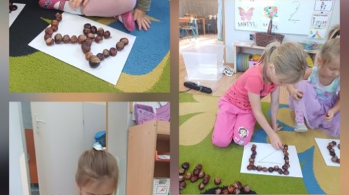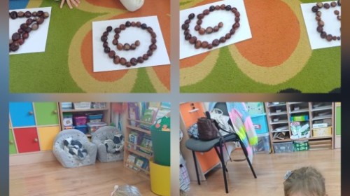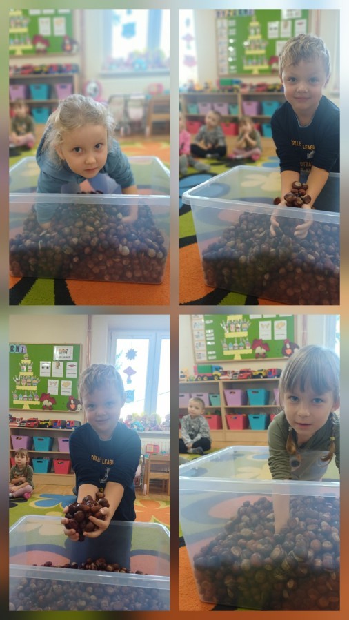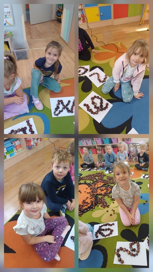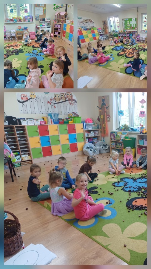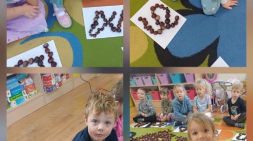 Tego dnia Mądre Sówki realizowały zajęcia z Ogólnopolskiego Projektu Edukacyjnego "Chcę być samodzielny - pozwól mi". Podczas zajęć dzieci bawiły sie kastanami określały jakie są. Jak również wykonywały działania matematyczne, ćwiczyły precyzję podczas układania wzorów z kasztanów. A na koniec zajęć pięknie posprzątały.