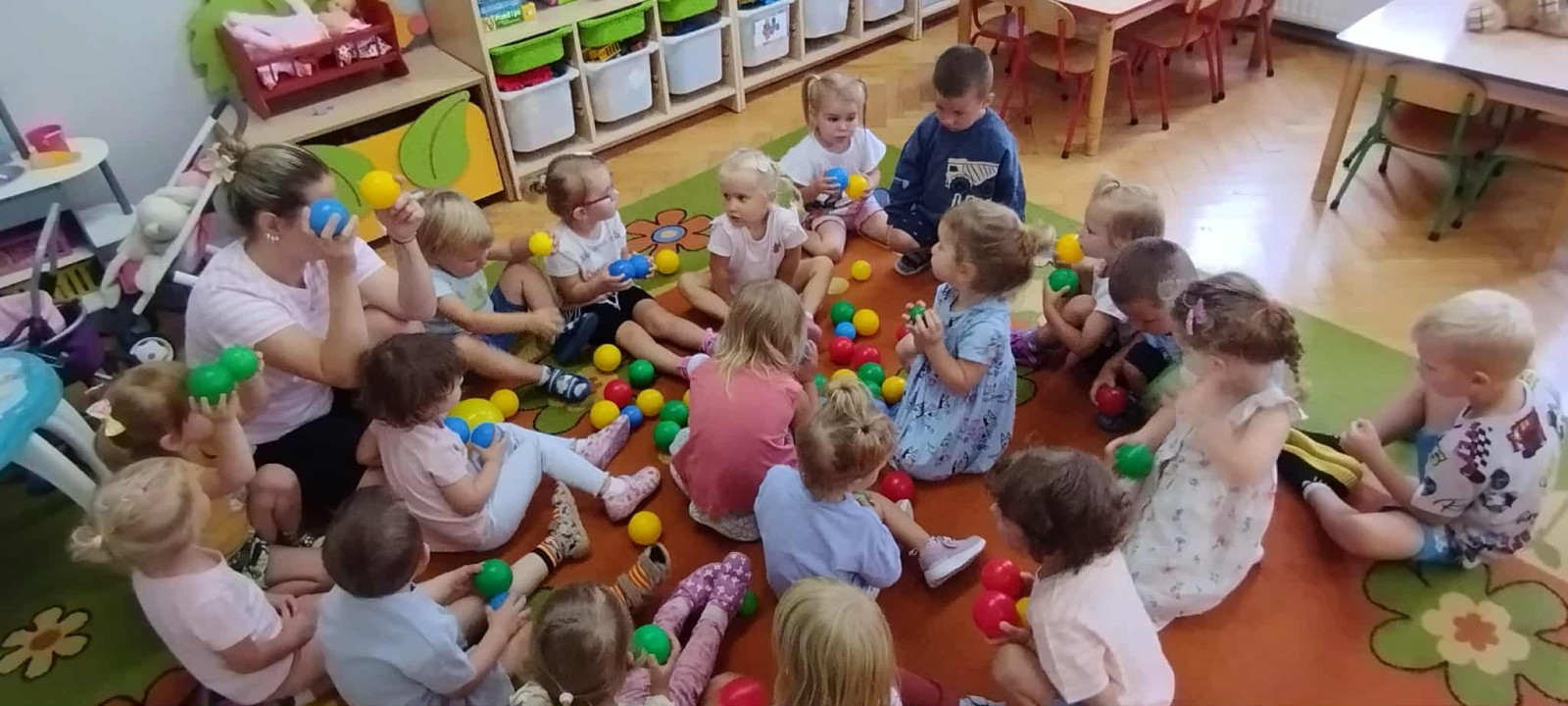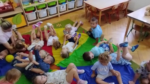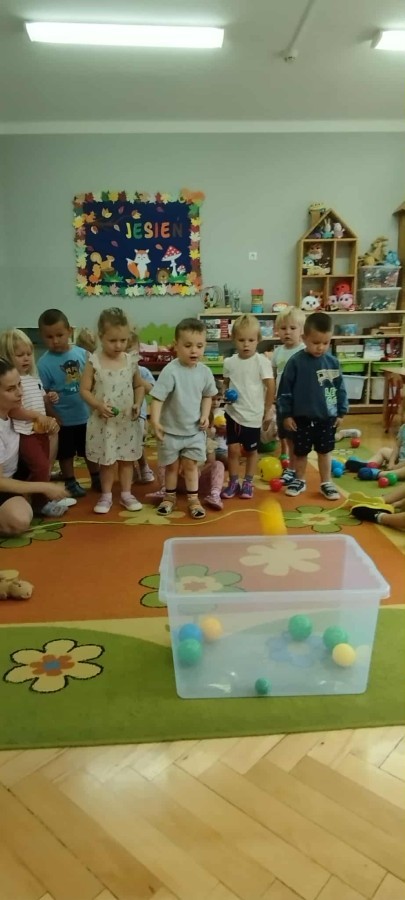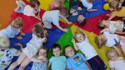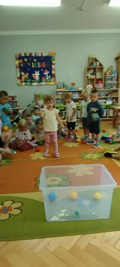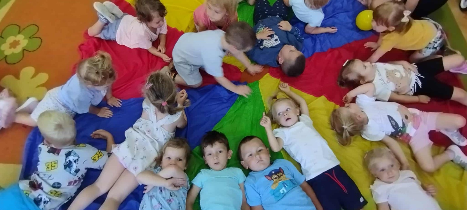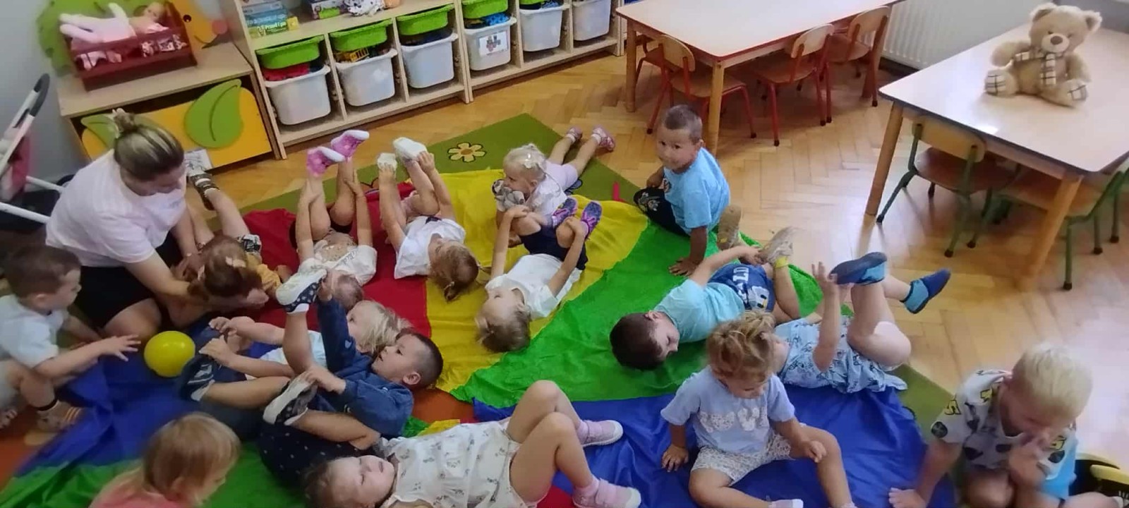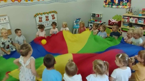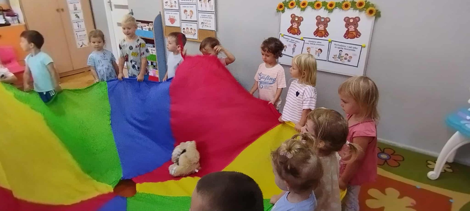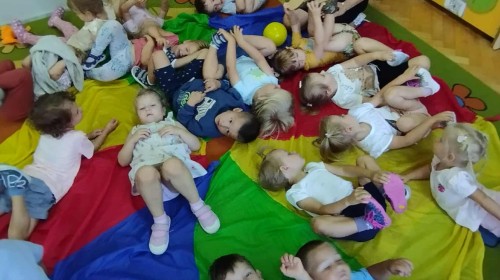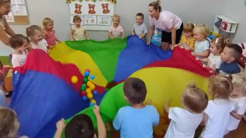 A tu czas zobaczyć co Wesołe Misie robiły podczas Dnia Kropki. Było kolorowo i wesoło. Maluszki bawiły się chustą animacyjną, wykonując polecenia Misia, poznawały kolory bawiąc sie kolorowymi piłkami i ćwiczyły rzuty do celu. Zajęcia się podobały ale były bardzo męczące dobrze, że można było odpocząć chwilę na kolorowej chuście😉