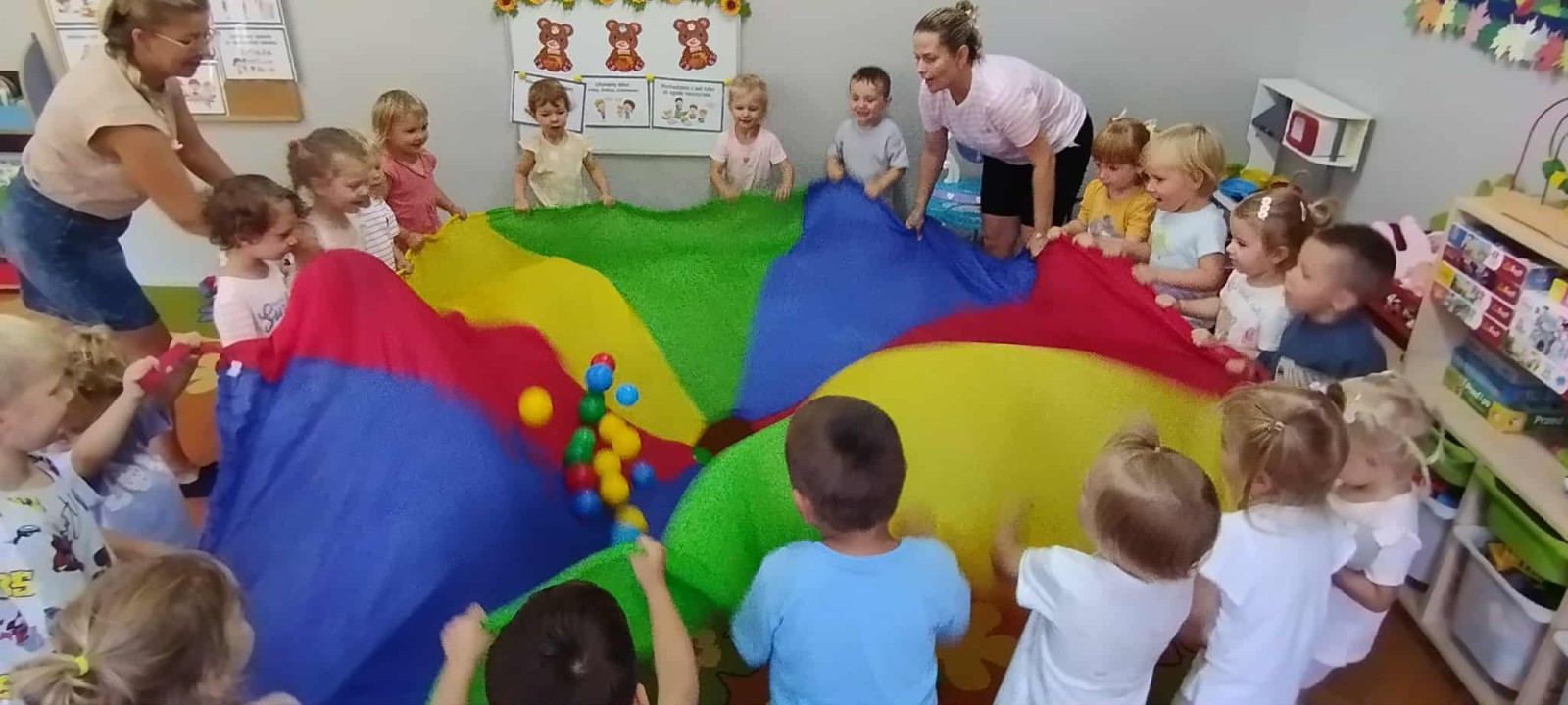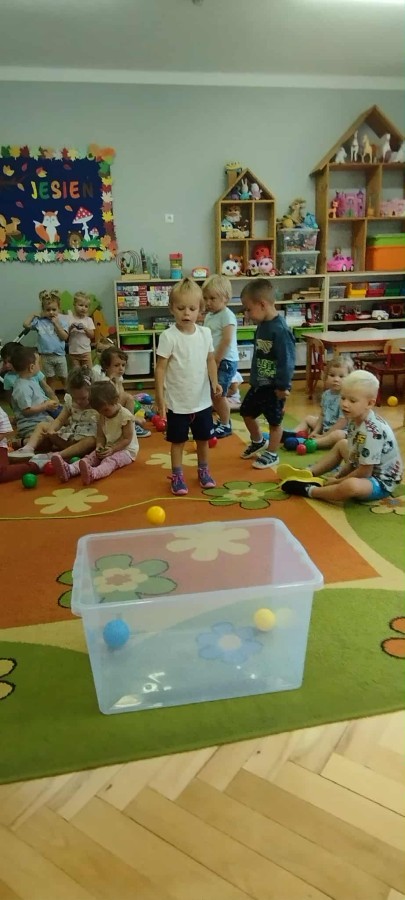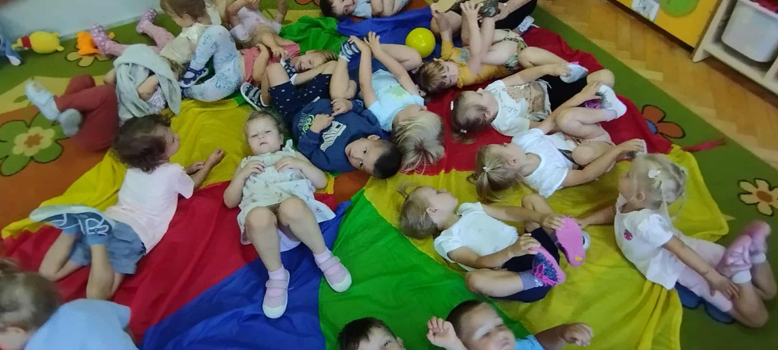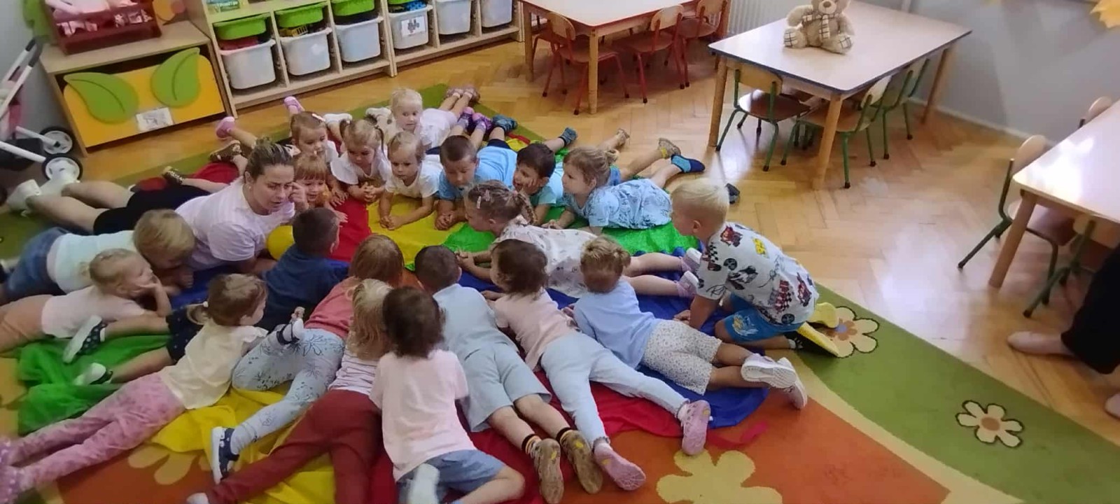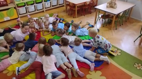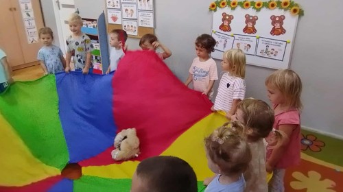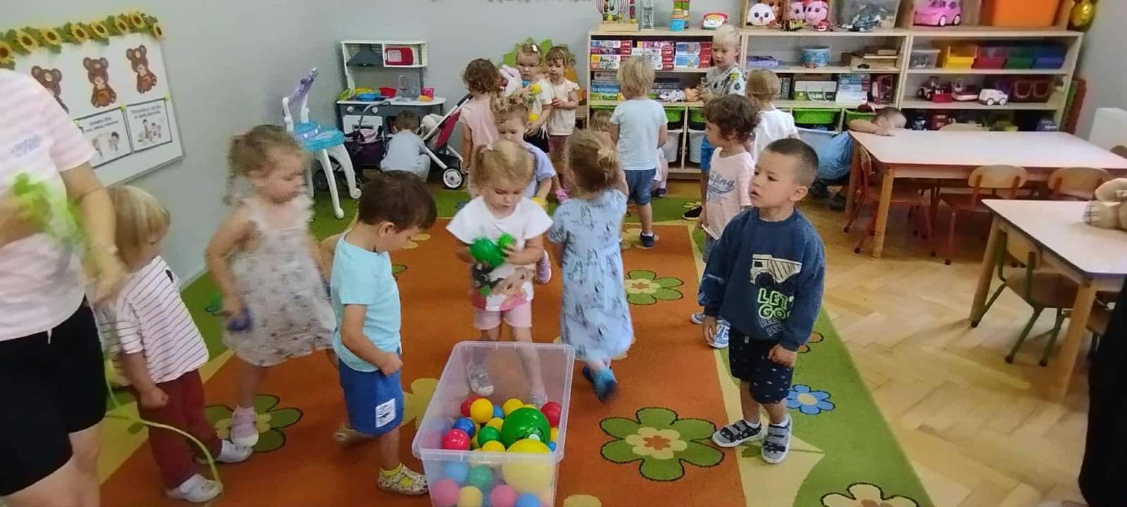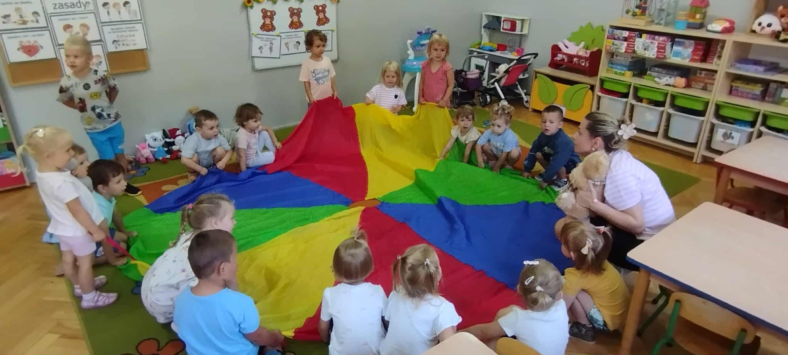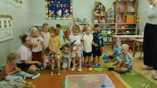 A tu czas zobaczyć co Wesołe Misie robiły podczas Dnia Kropki. Było kolorowo i wesoło. Maluszki bawiły się chustą animacyjną, wykonując polecenia Misia, poznawały kolory bawiąc sie kolorowymi piłkami i ćwiczyły rzuty do celu. Zajęcia się podobały ale były bardzo męczące dobrze, że można było odpocząć chwilę na kolorowej chuście😉