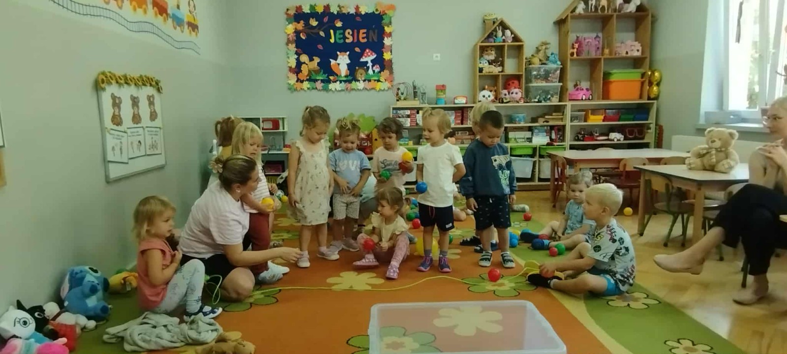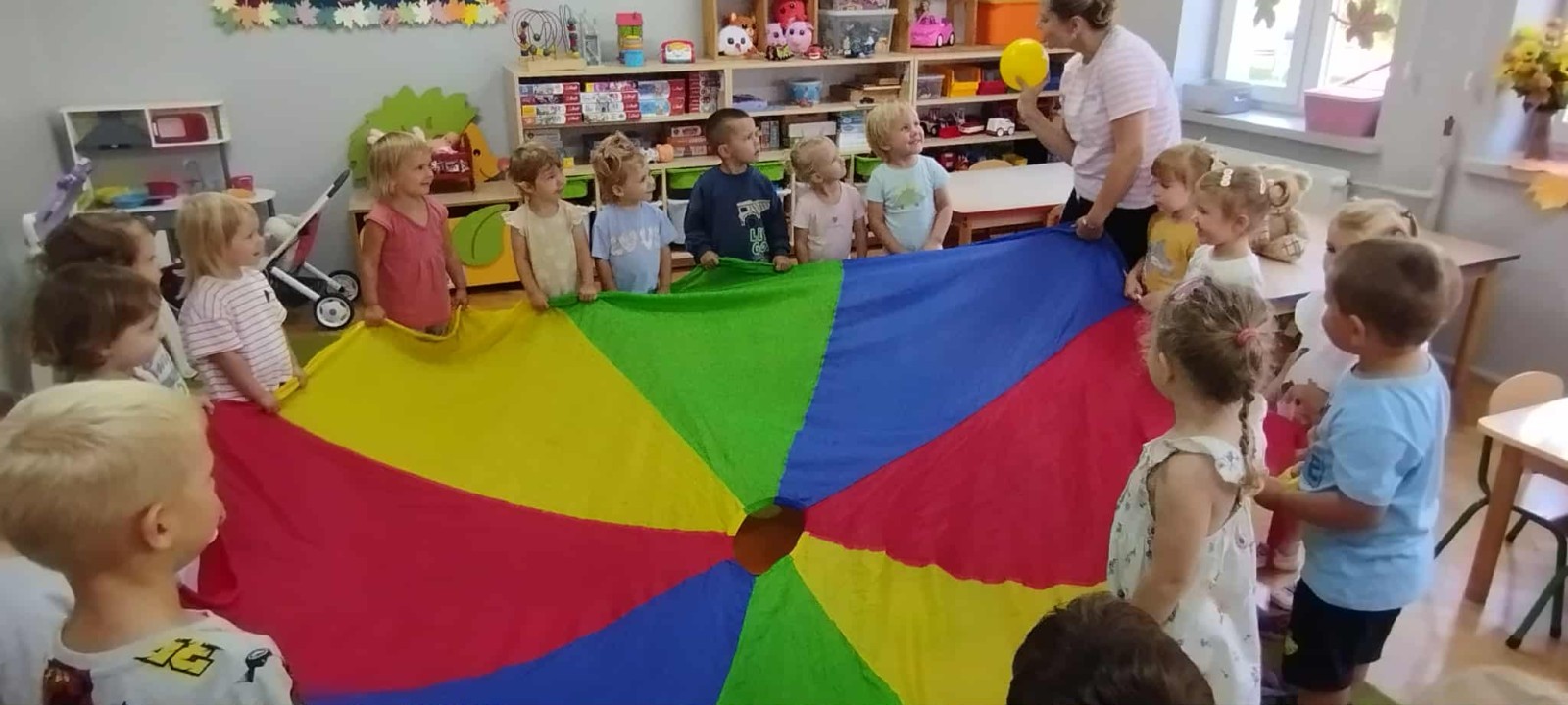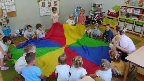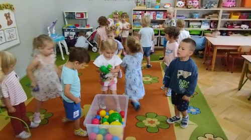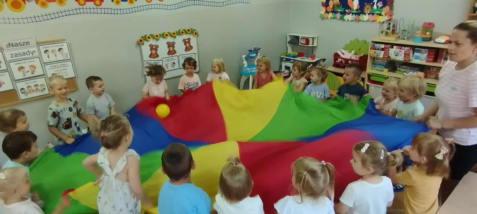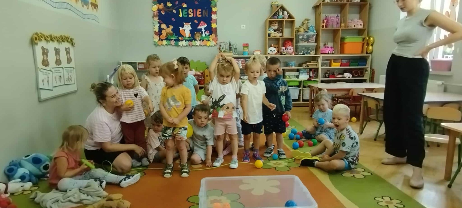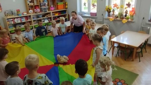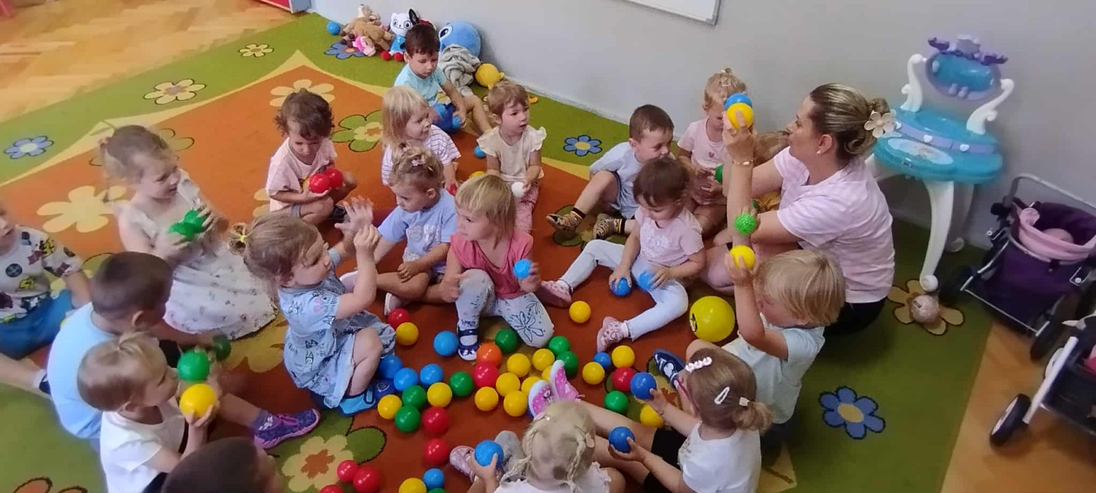 A tu czas zobaczyć co Wesołe Misie robiły podczas Dnia Kropki. Było kolorowo i wesoło. Maluszki bawiły się chustą animacyjną, wykonując polecenia Misia, poznawały kolory bawiąc sie kolorowymi piłkami i ćwiczyły rzuty do celu. Zajęcia się podobały ale były bardzo męczące dobrze, że można było odpocząć chwilę na kolorowej chuście😉