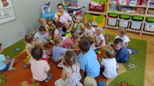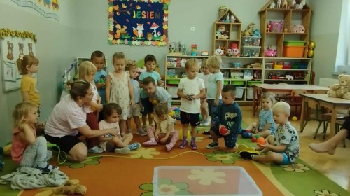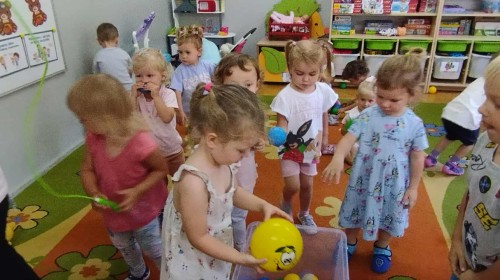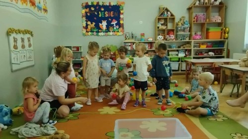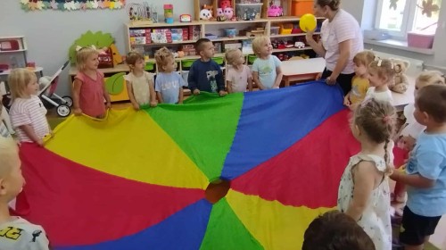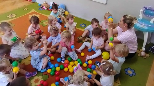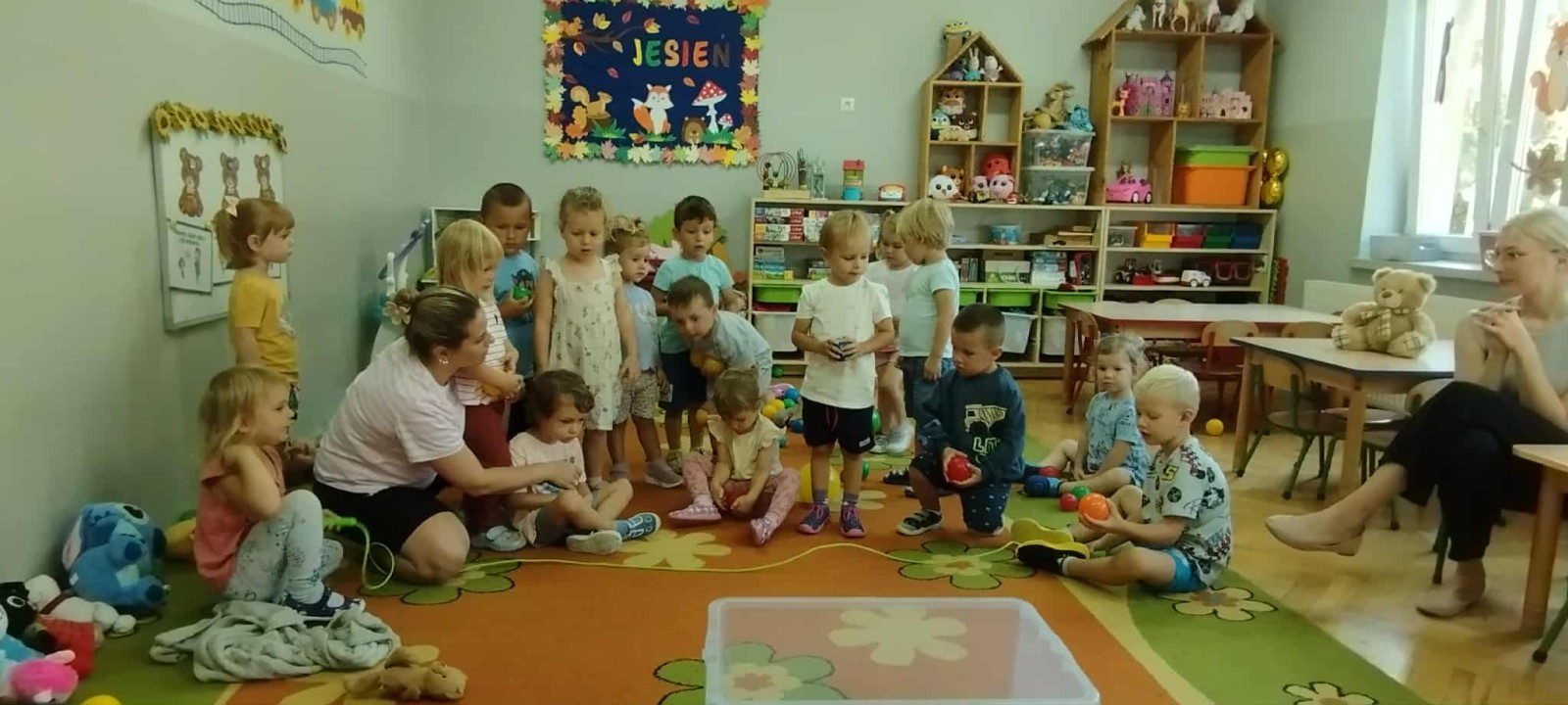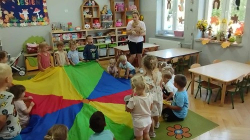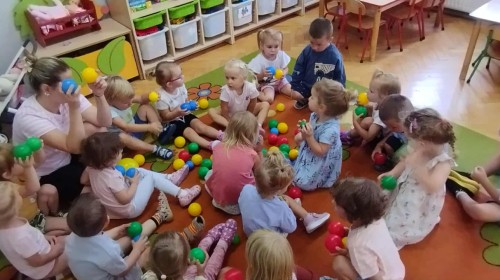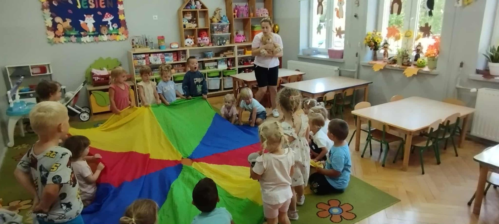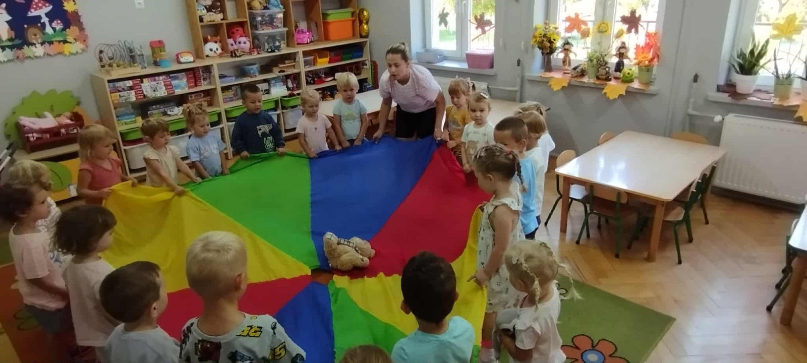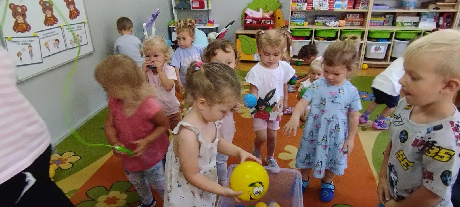 A tu czas zobaczyć co Wesołe Misie robiły podczas Dnia Kropki. Było kolorowo i wesoło. Maluszki bawiły się chustą animacyjną, wykonując polecenia Misia, poznawały kolory bawiąc sie kolorowymi piłkami i ćwiczyły rzuty do celu. Zajęcia się podobały ale były bardzo męczące dobrze, że można było odpocząć chwilę na kolorowej chuście😉