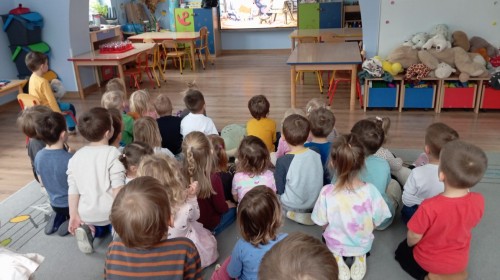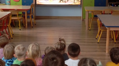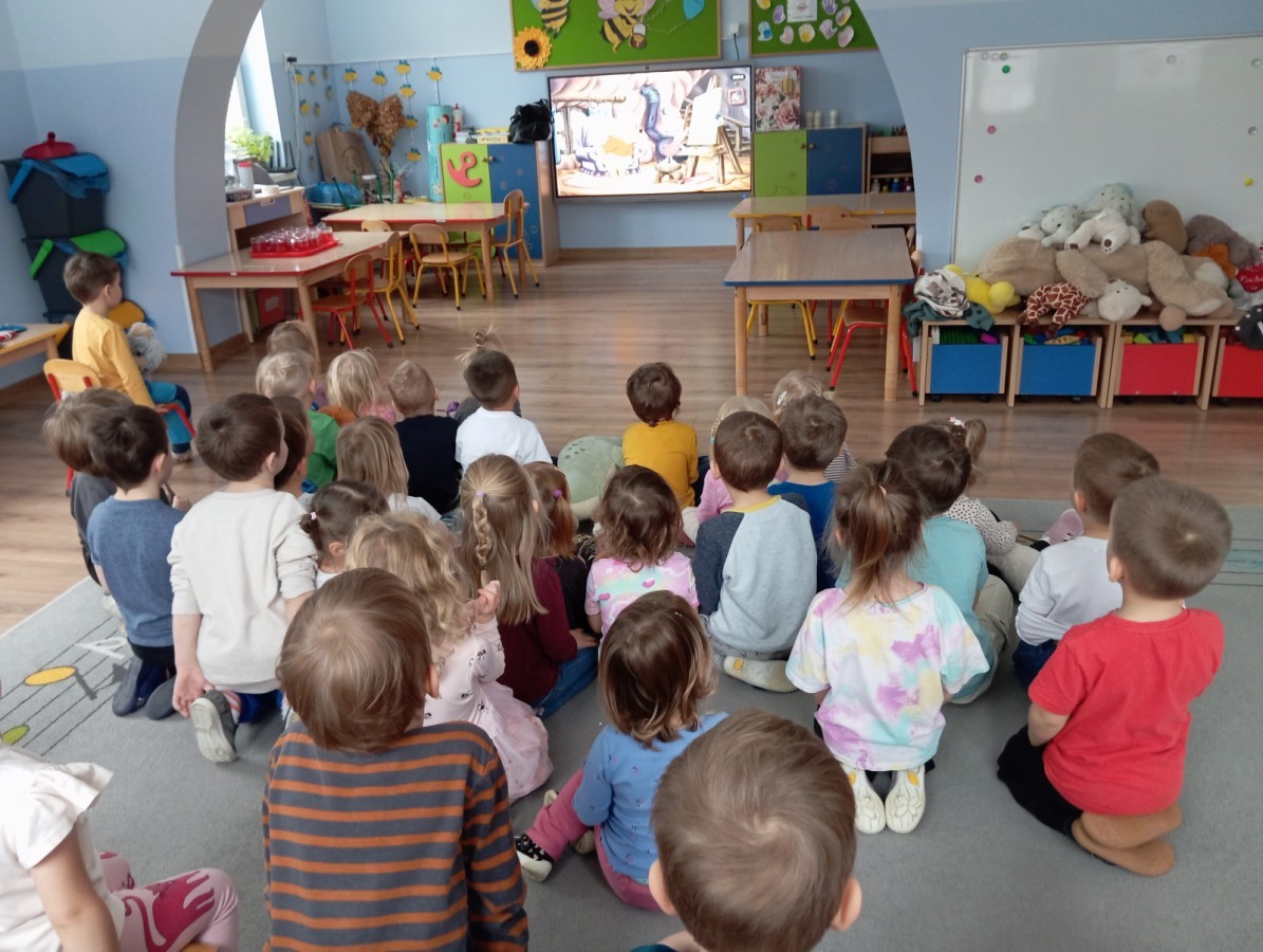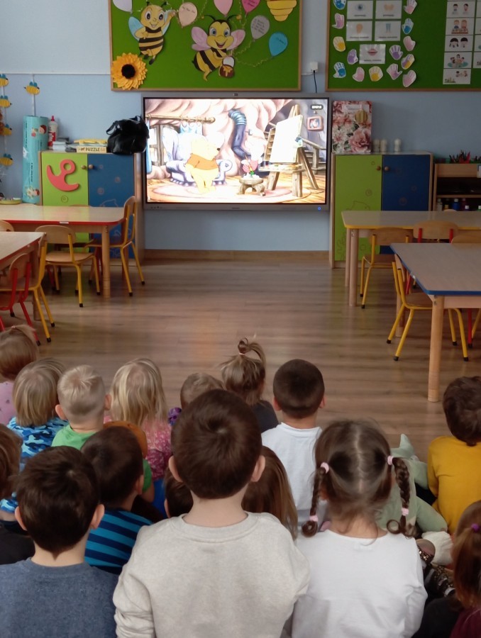 Oczywiście, jak na Dzień Misia przystało, zaprosiliśmy do naszej sali kolegów z grupy Wesołych Misiów i wspólnie obejrzeliśmy bajkę o najsłynniejszym misiu na świecie — Kubusiu Puchatku.