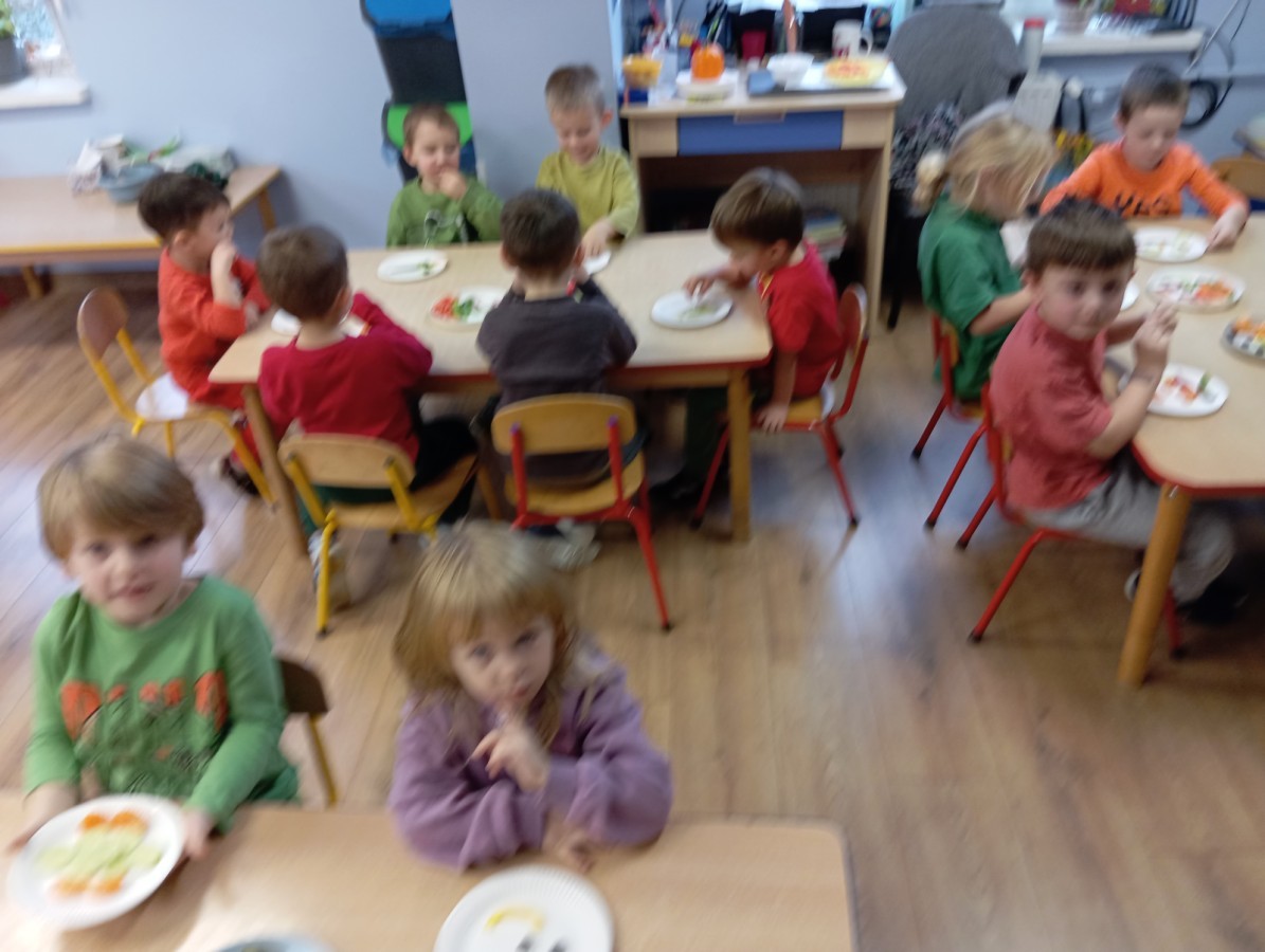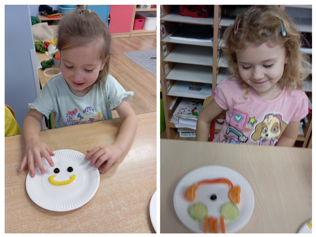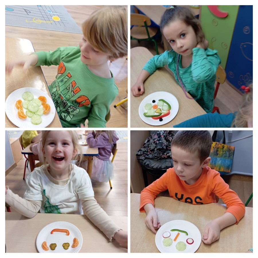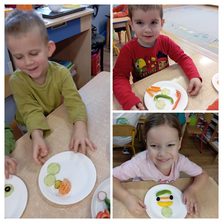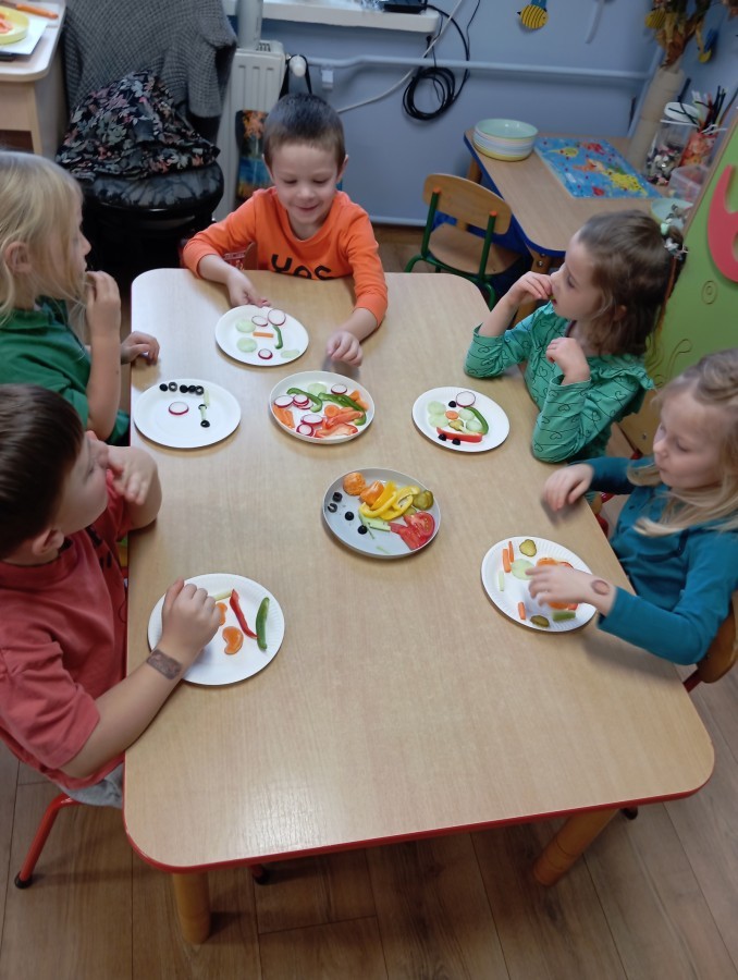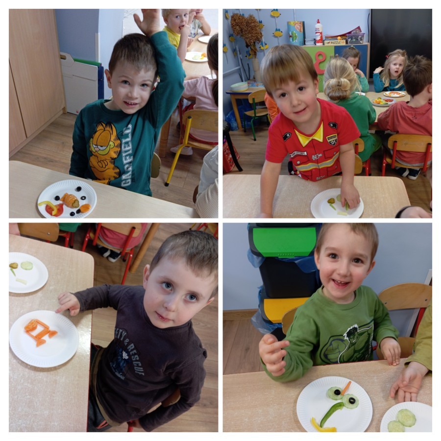 Każdy przedszkolak miał okazję zaprezentować swoje warzywo przed grupą, ćwicząc odwagę i umiejętność wypowiedzi. Potem dzieci tworzyły na talerzach kolorowe, warzywne obrazy, z których powstały prawdziwe małe dzieła sztuki — a na koniec wszystko zostało z apetytem zjedzone!