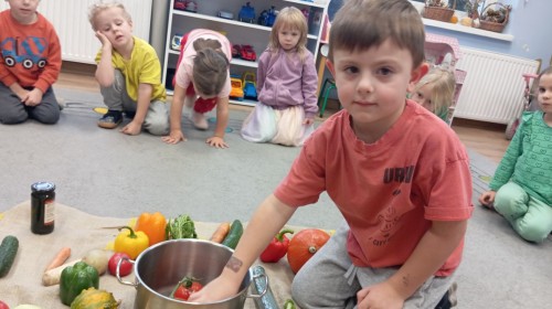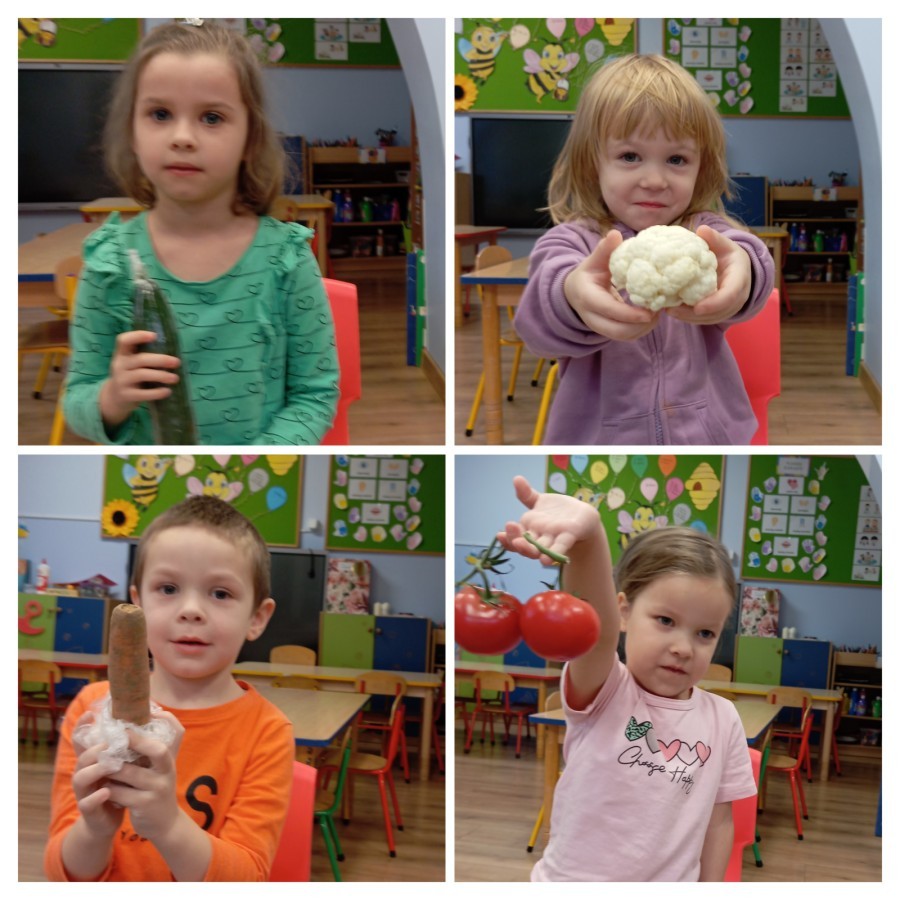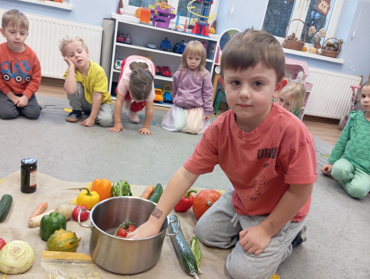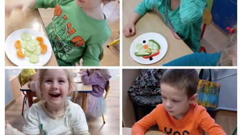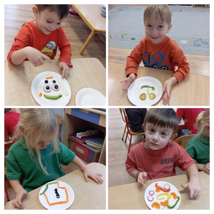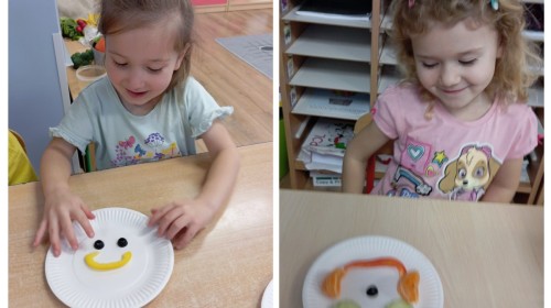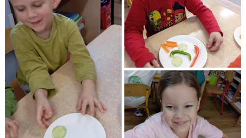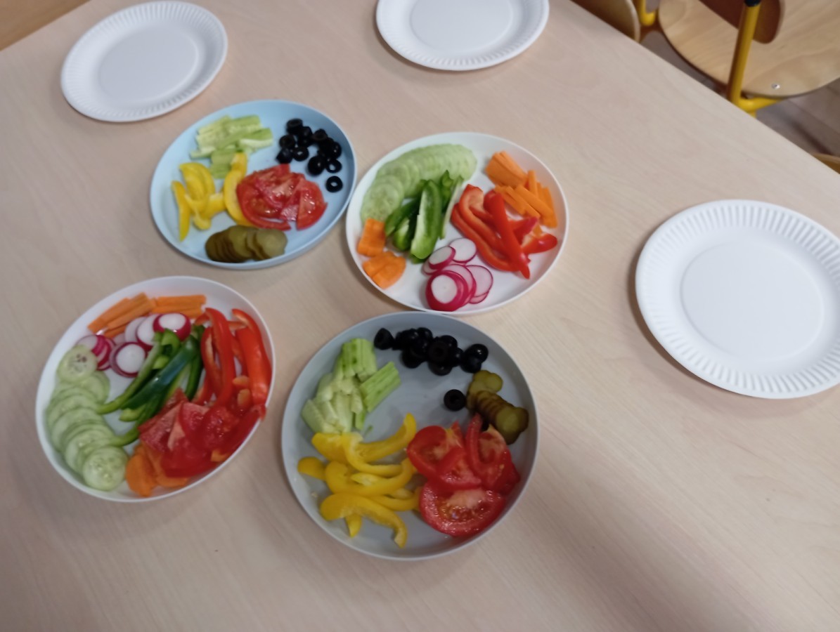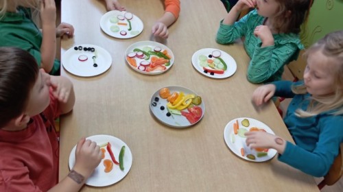 Każdy przedszkolak miał okazję zaprezentować swoje warzywo przed grupą, ćwicząc odwagę i umiejętność wypowiedzi. Potem dzieci tworzyły na talerzach kolorowe, warzywne obrazy, z których powstały prawdziwe małe dzieła sztuki — a na koniec wszystko zostało z apetytem zjedzone!