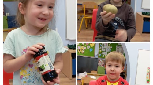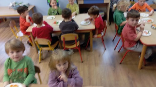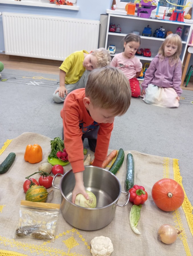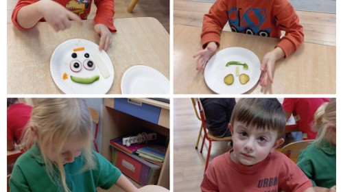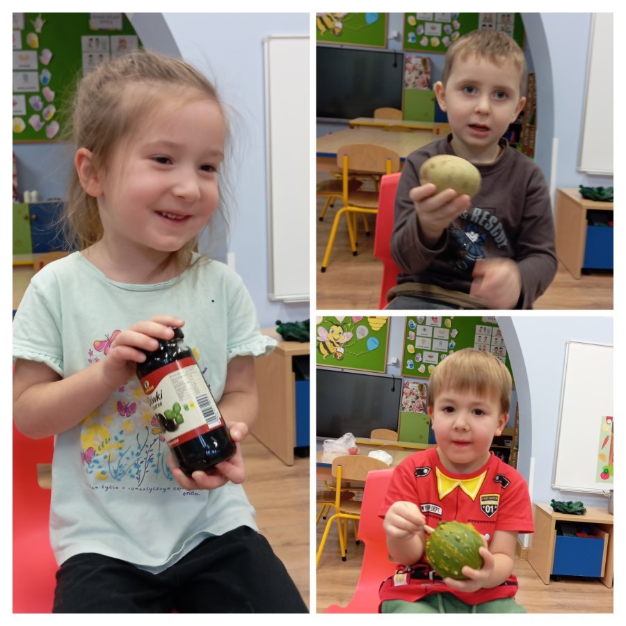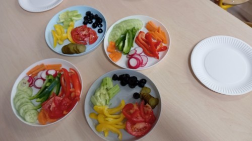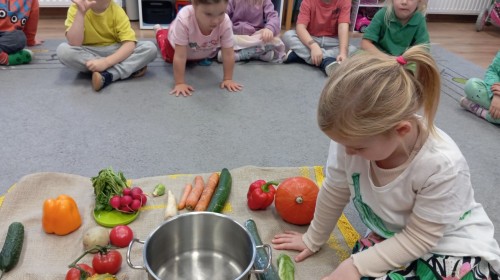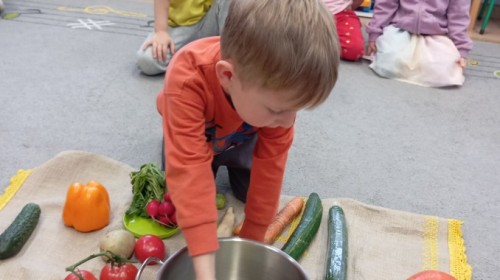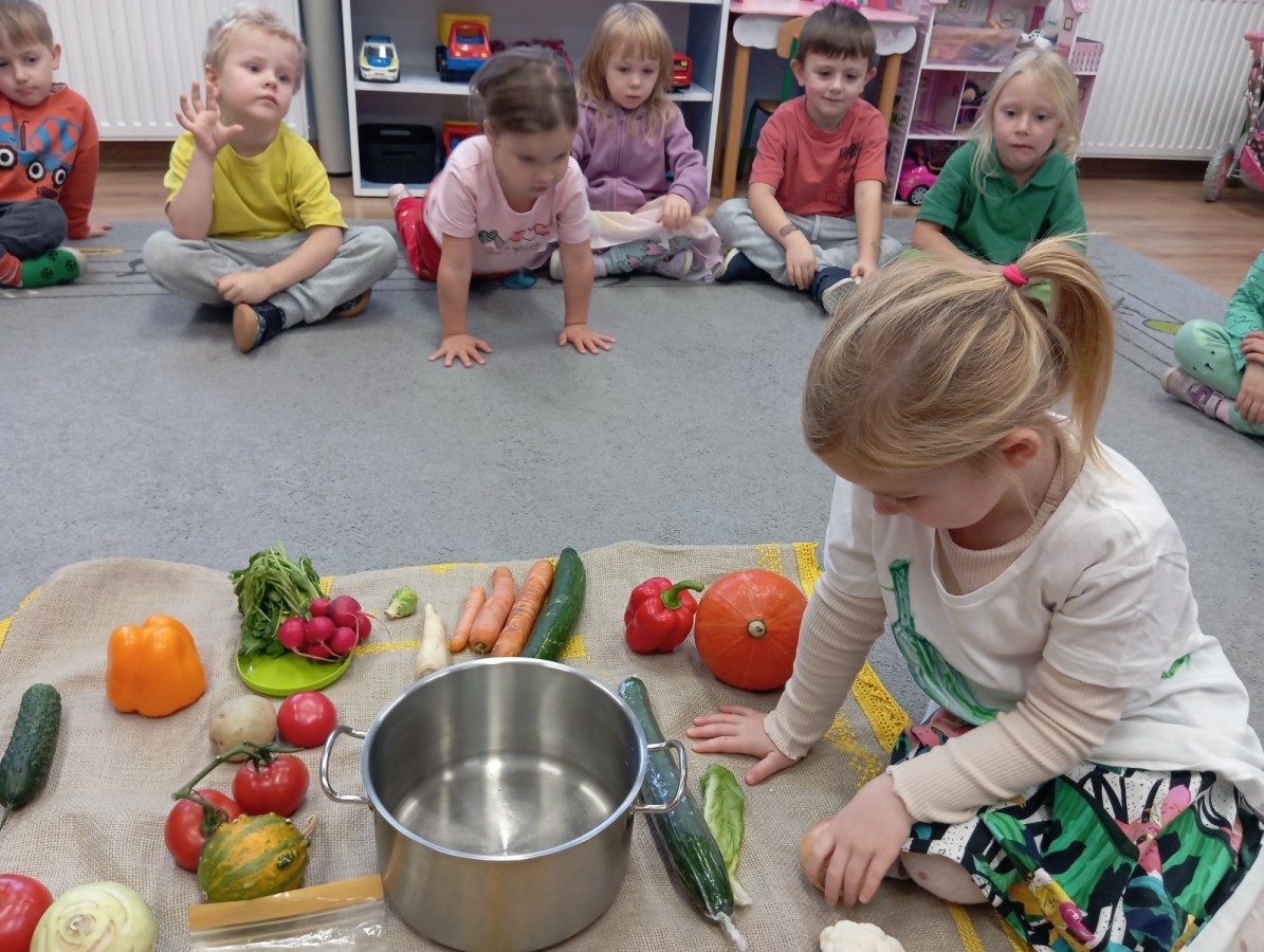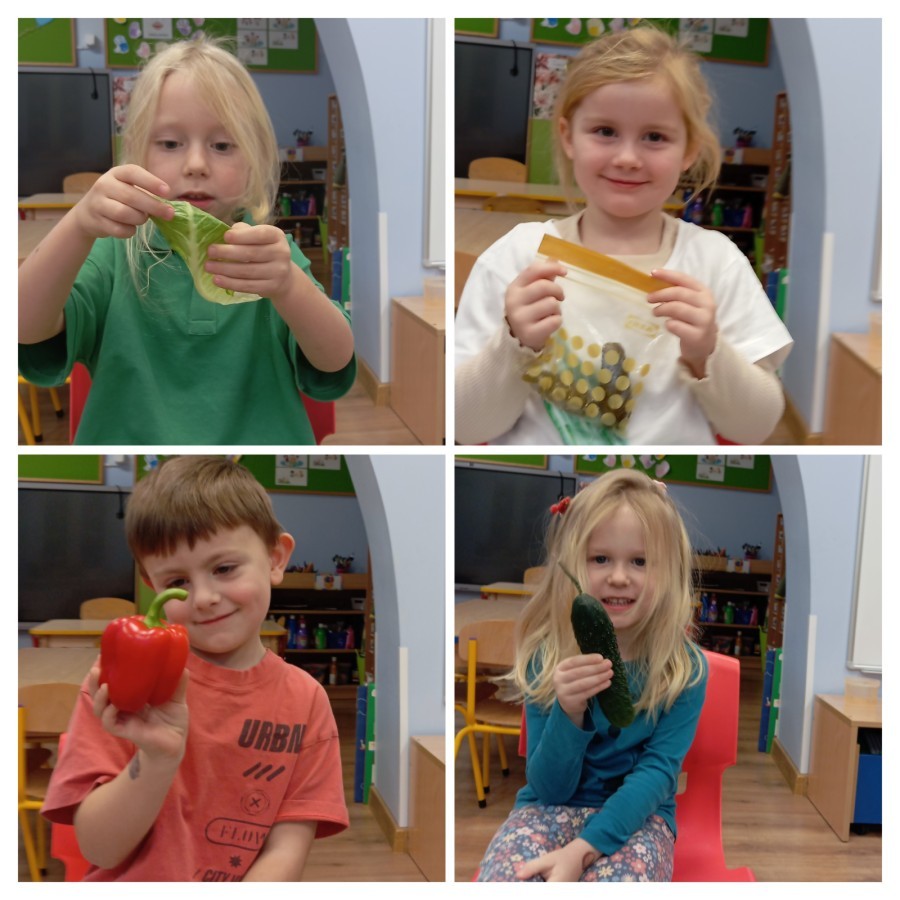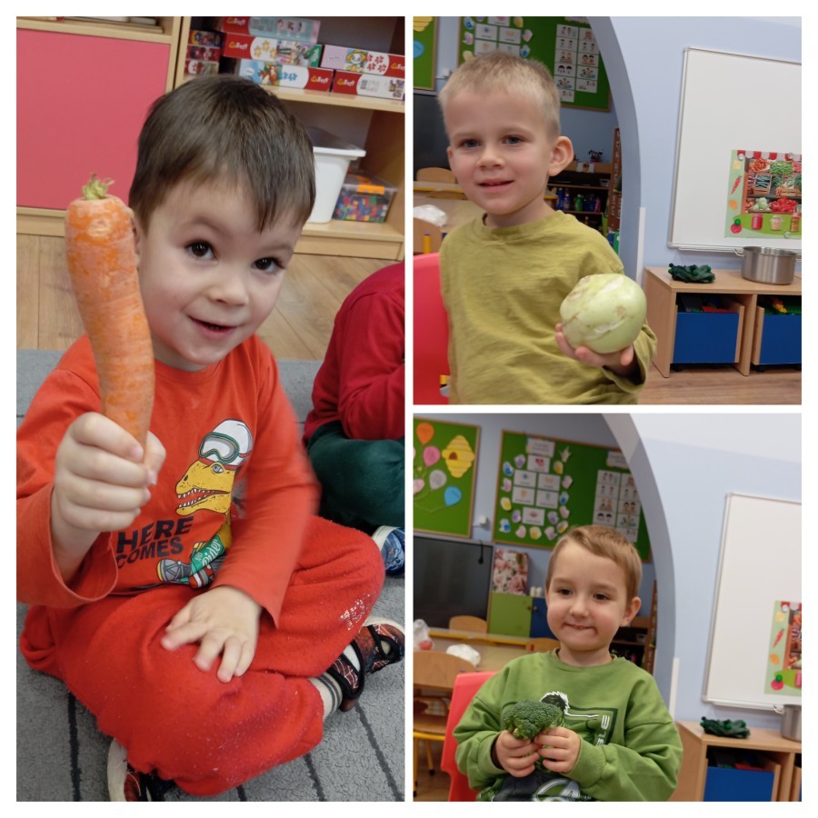 Każdy przedszkolak miał okazję zaprezentować swoje warzywo przed grupą, ćwicząc odwagę i umiejętność wypowiedzi. Potem dzieci tworzyły na talerzach kolorowe, warzywne obrazy, z których powstały prawdziwe małe dzieła sztuki — a na koniec wszystko zostało z apetytem zjedzone!