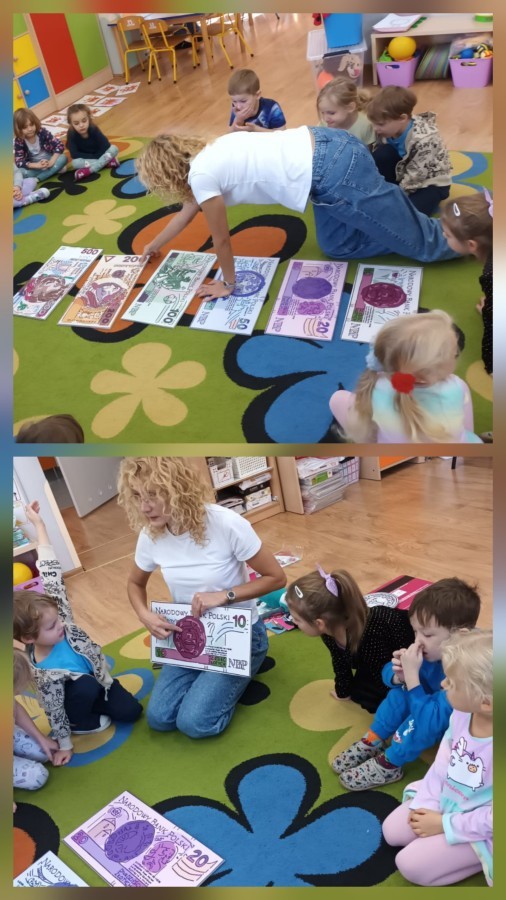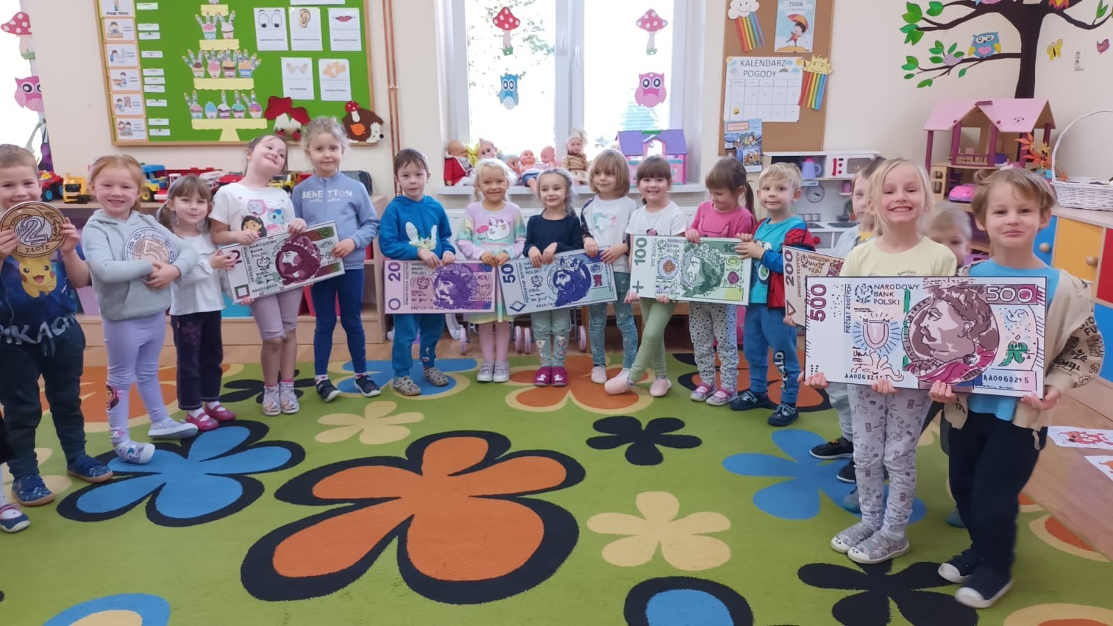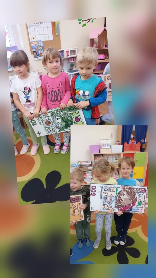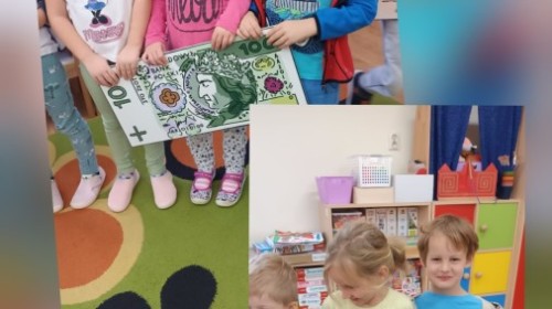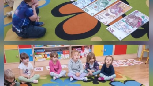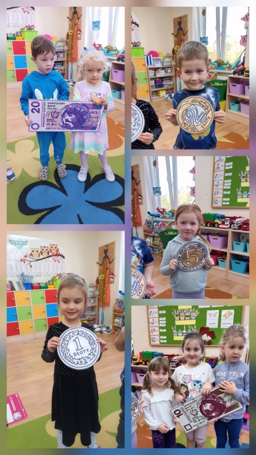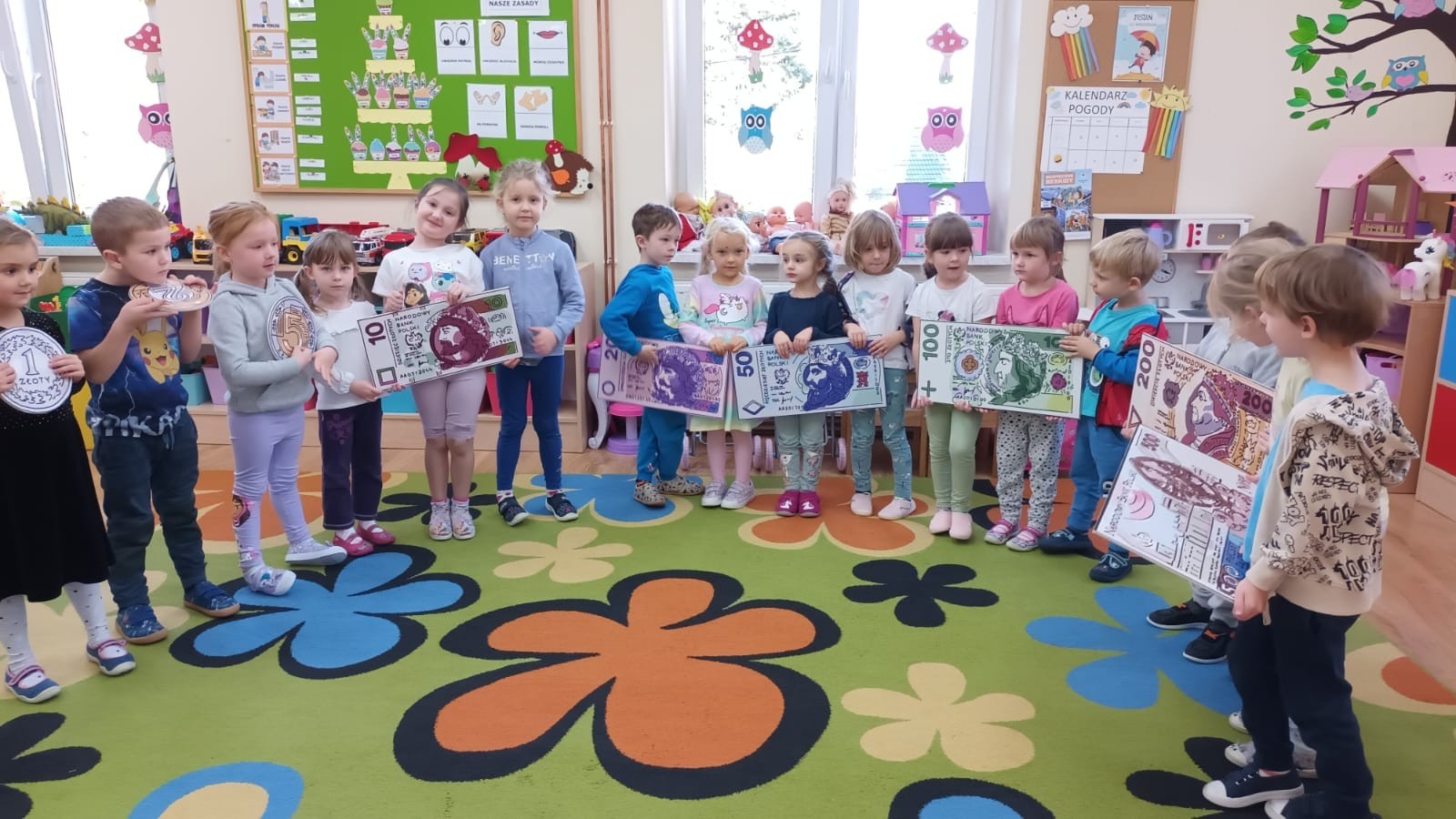 Przedszkolaki dowiedziały się skąd się biorą pieniądze, jak wyglądają monety i banknoty w Polsce i porównywali ich wartość. Usłyszeli jakie mamy sposoby płatności (karta, gotówką, płatność zegarkiem). Dlaczego za jedną monetę nie można kupić wszystkiego na co mają ochotę i dlaczego pieniędzy z bankomatu nie można wyciągać bez końca. Robiły zakupy za które musiały zapłacić jednym z poznanych sposobów płatności. Również dokonywali płatności za przejaz autostradą za pomocą karty i kodu PIN. Dowiedzieli się jakie mamy znaki wodne na banknotach, próbowali je dojrzeć poprzez przyłożenie banknotu do światła.