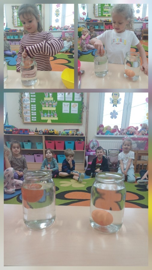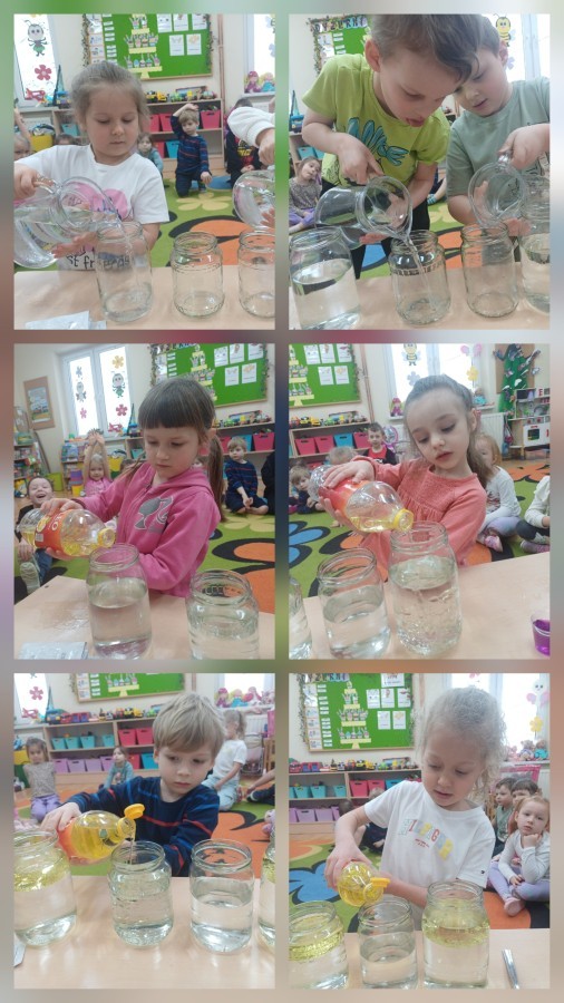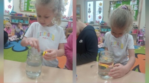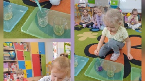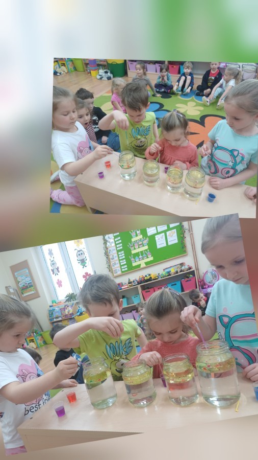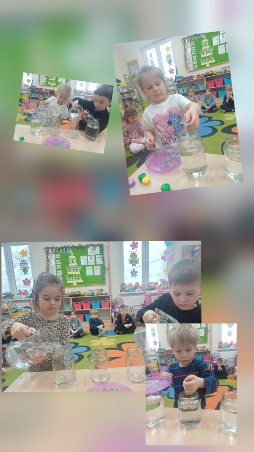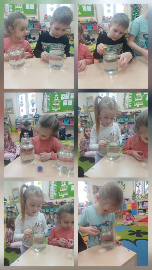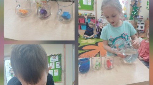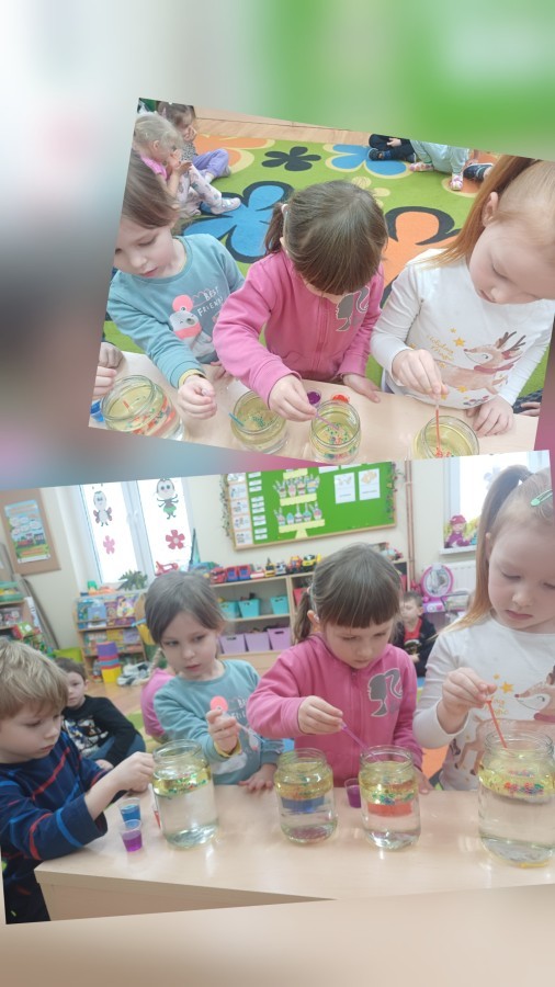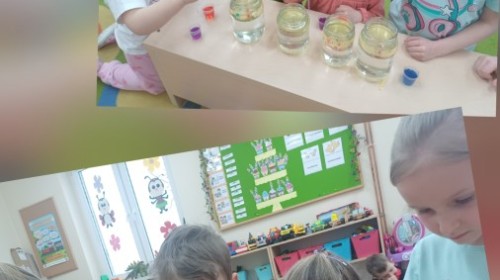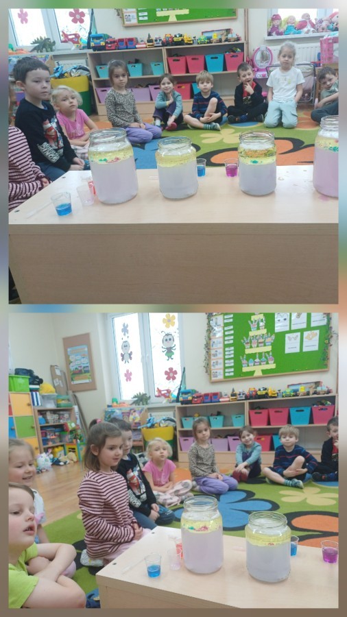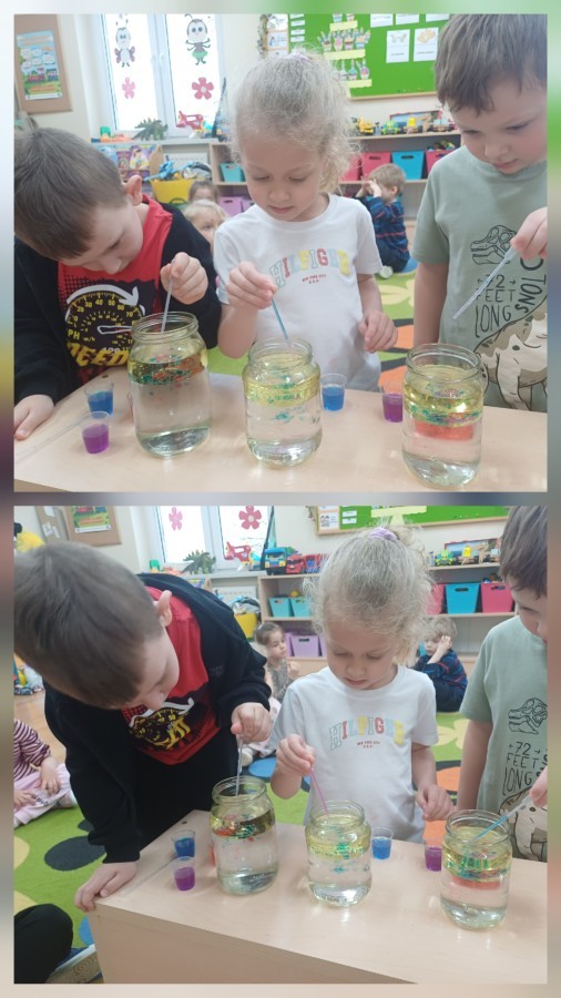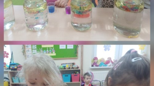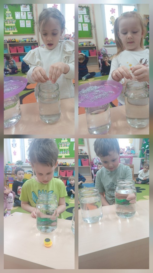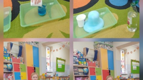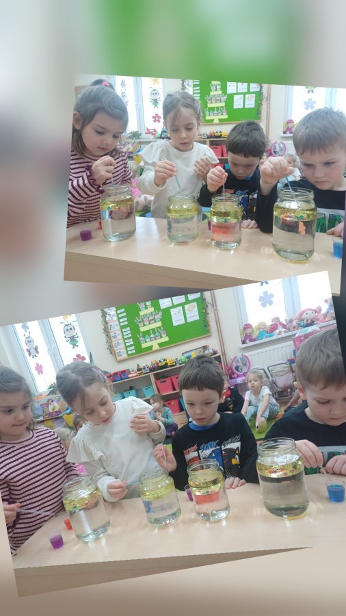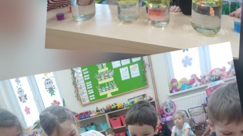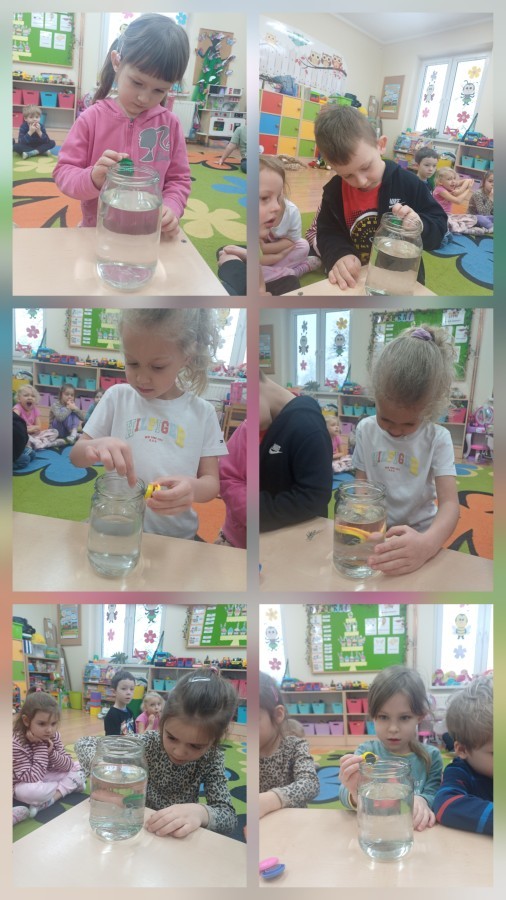 W tym tygodniu podczas zajęć przedszkolaki eksperymentowały sprawdzały jak można zrobić burze i tornado w słoiku. Łowiły spinacze ze słoika, sprawdzały kiedy jajko tonie a kiedy pływa, mieszały kolory, oraz wykonuwały kolorowe wulkany. Podczas zajęć dzieci samodzielnie wyciagały wnioski. Zabawy bardzo im się podoły.