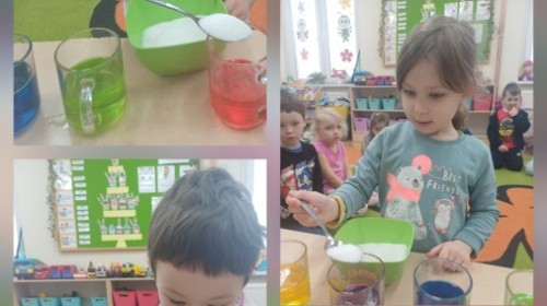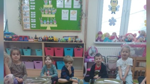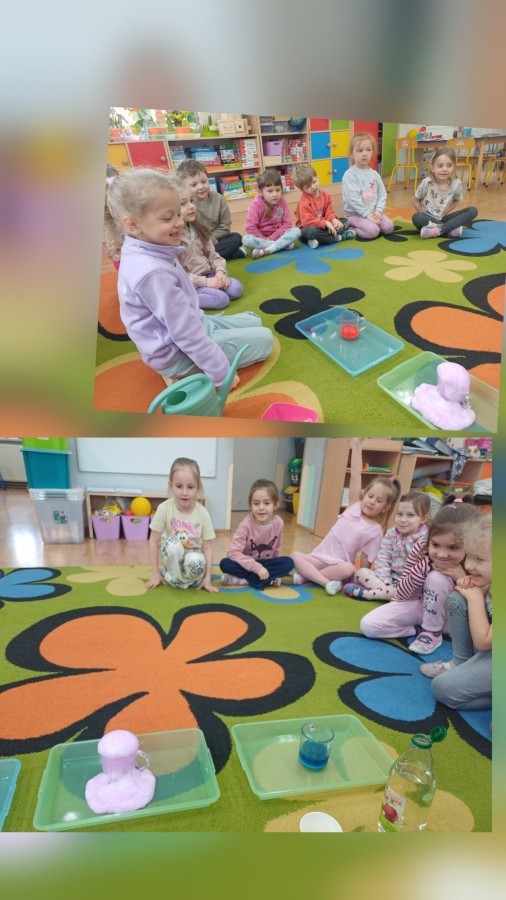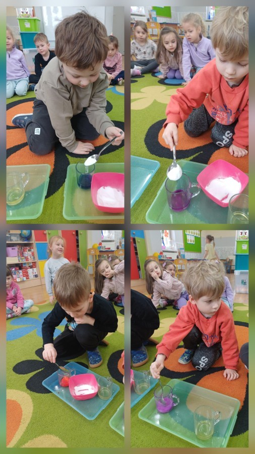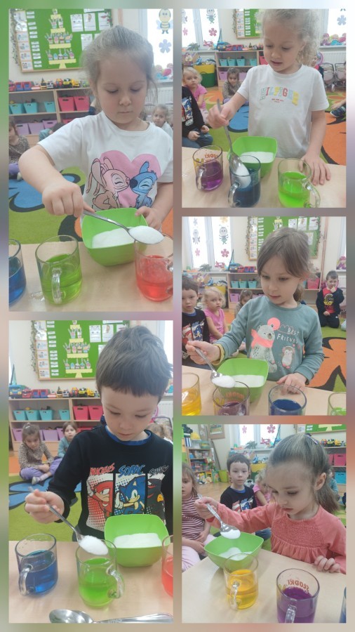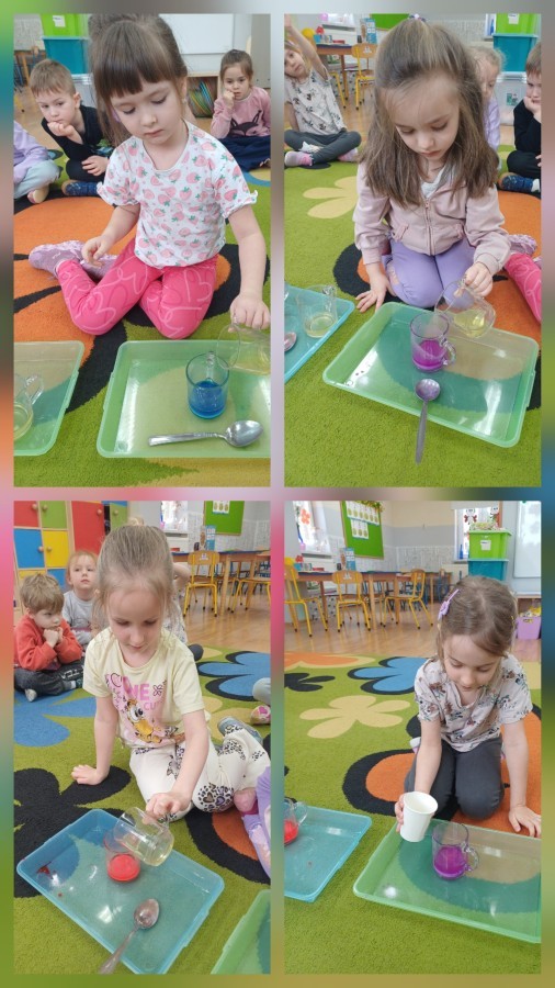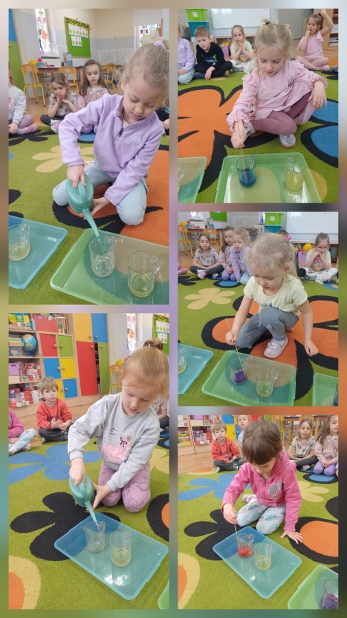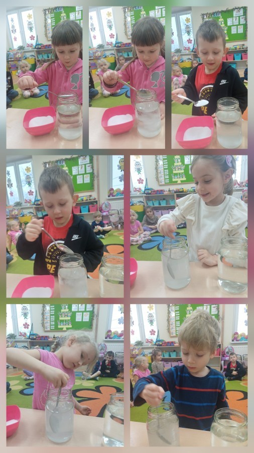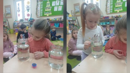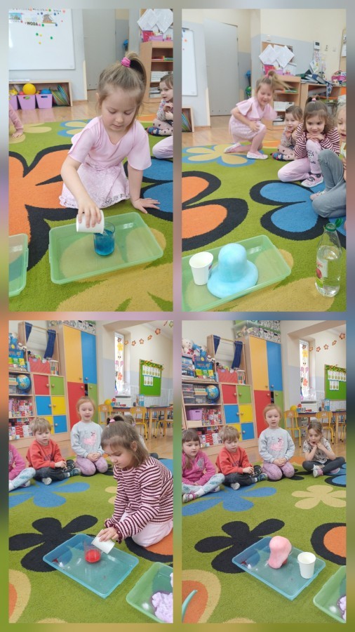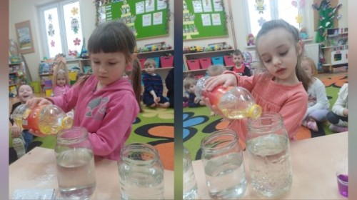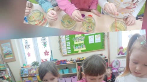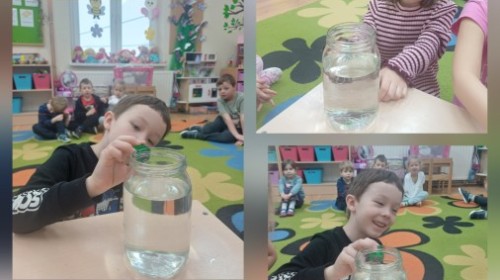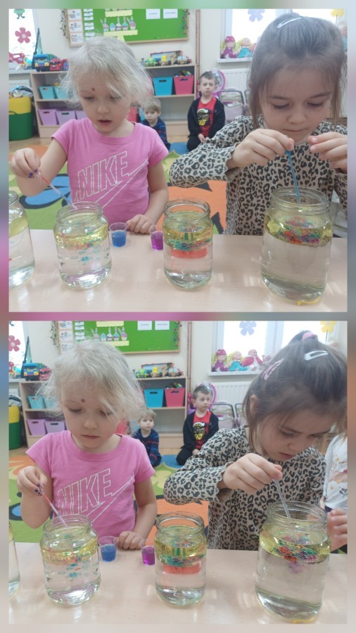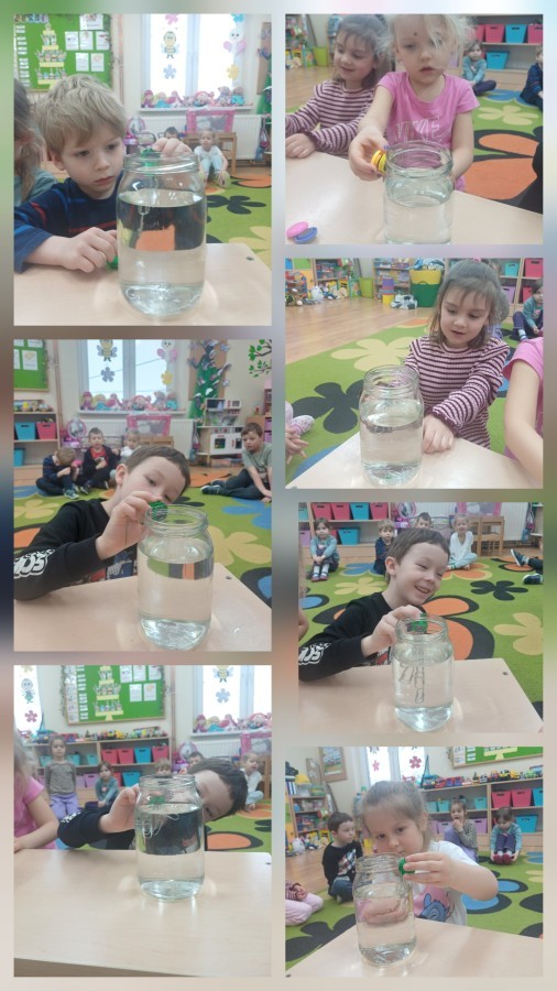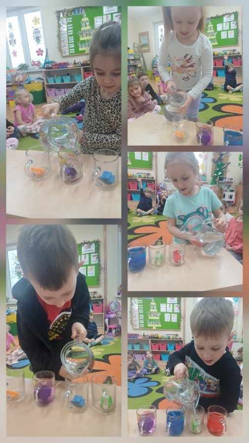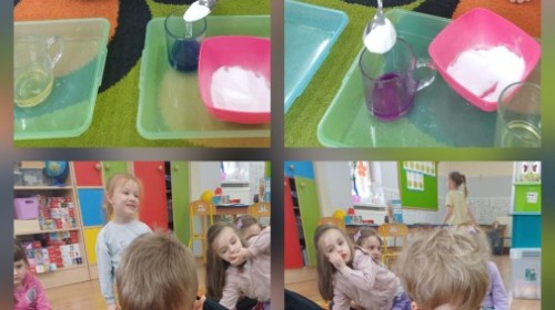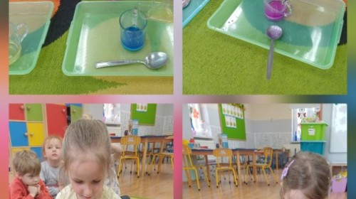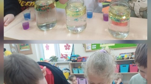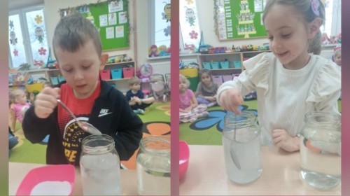 W tym tygodniu podczas zajęć przedszkolaki eksperymentowały sprawdzały jak można zrobić burze i tornado w słoiku. Łowiły spinacze ze słoika, sprawdzały kiedy jajko tonie a kiedy pływa, mieszały kolory, oraz wykonuwały kolorowe wulkany. Podczas zajęć dzieci samodzielnie wyciagały wnioski. Zabawy bardzo im się podoły.