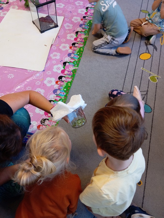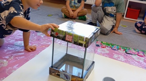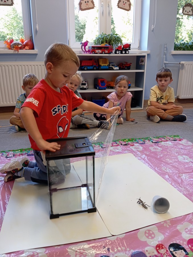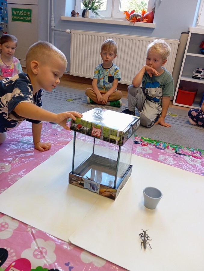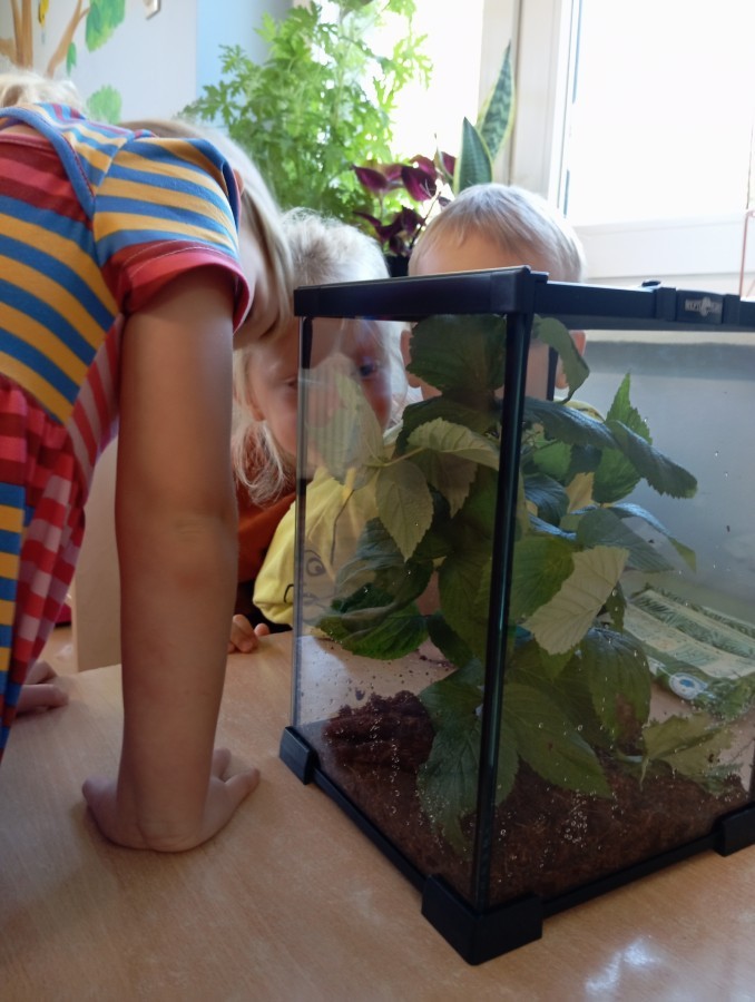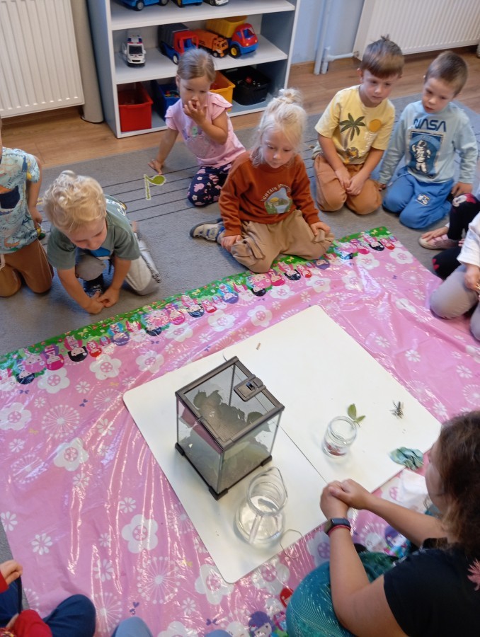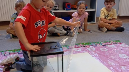 W ubiegłym tygodniu w naszej grupie pojawili się nowi, bardzo wyjątkowi przyjaciele – patyczaki! Przedszkolaki z wielkim zaangażowaniem przygotowały dla nich przytulne terrarium – zadbały o odpowiednie podłoże z torfu, liście malin i spokojne miejsce do życia.