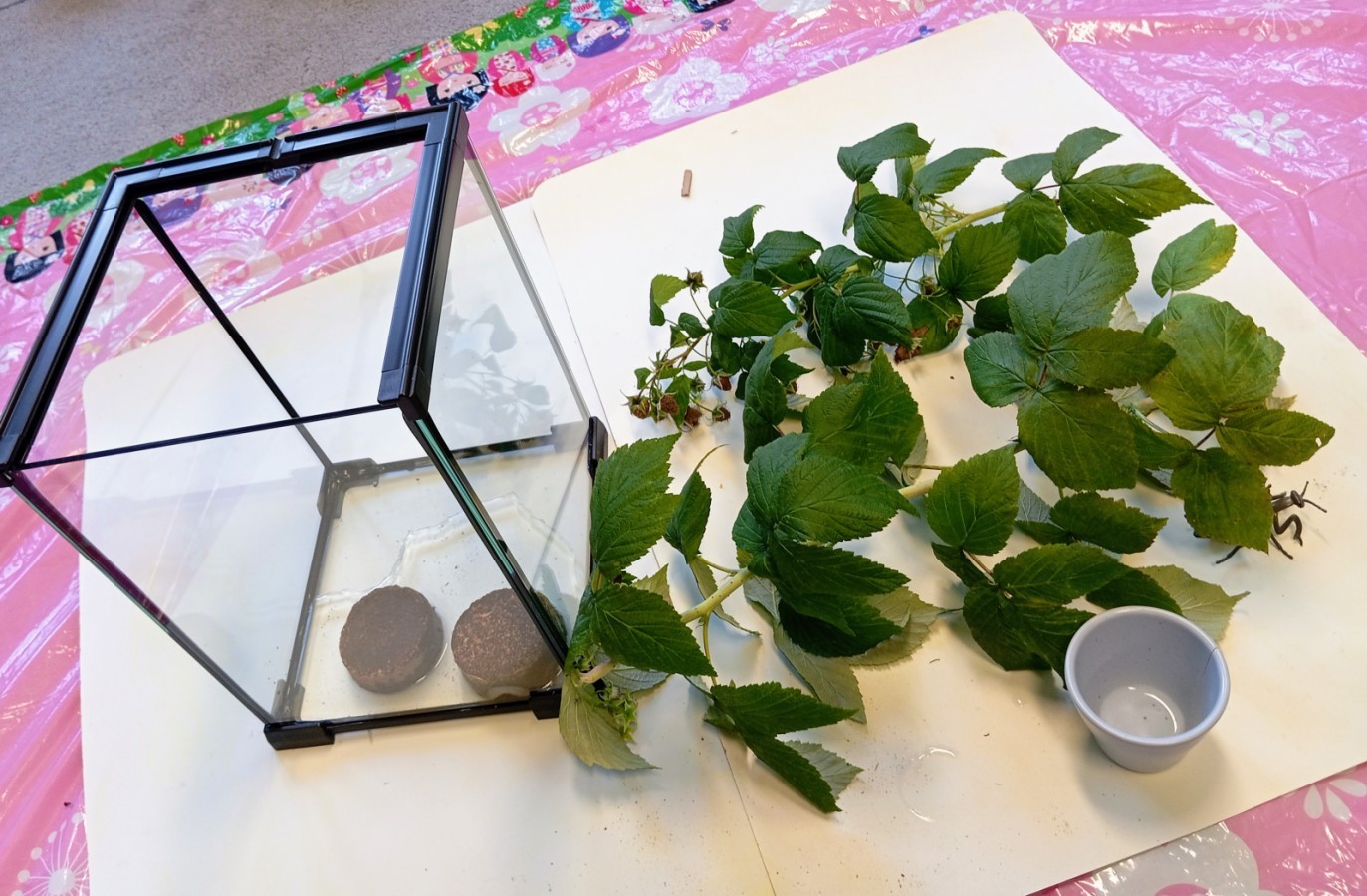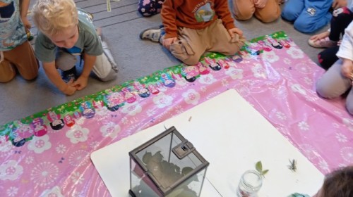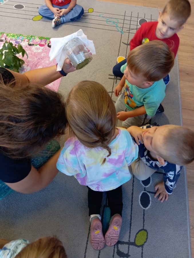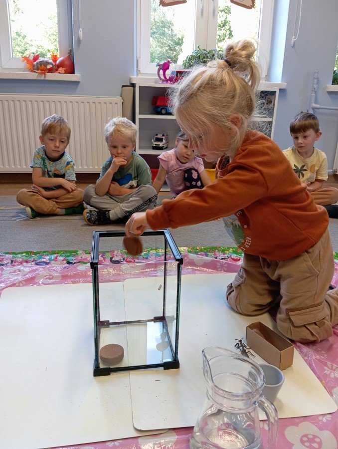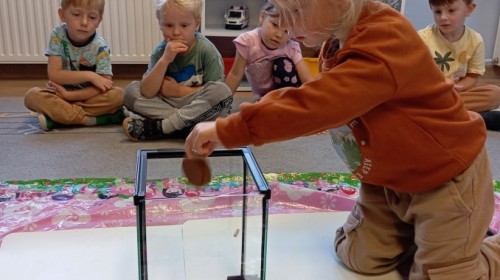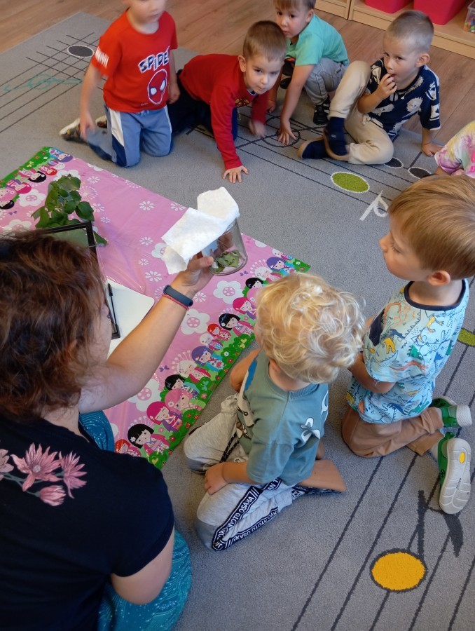 W ubiegłym tygodniu w naszej grupie pojawili się nowi, bardzo wyjątkowi przyjaciele – patyczaki! Przedszkolaki z wielkim zaangażowaniem przygotowały dla nich przytulne terrarium – zadbały o odpowiednie podłoże z torfu, liście malin i spokojne miejsce do życia.