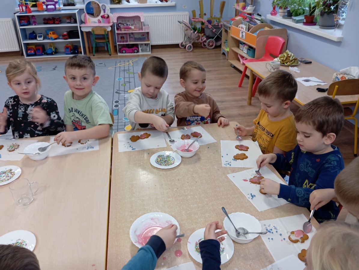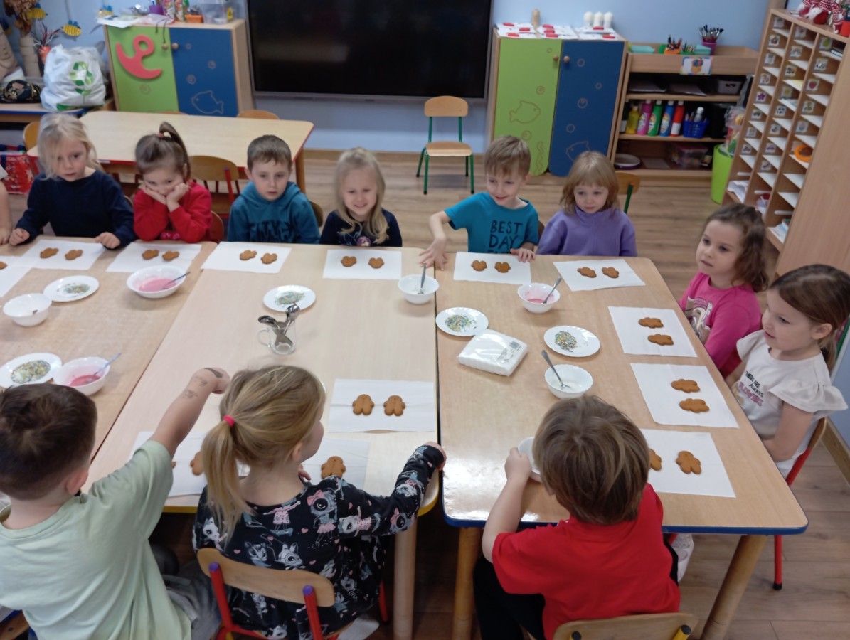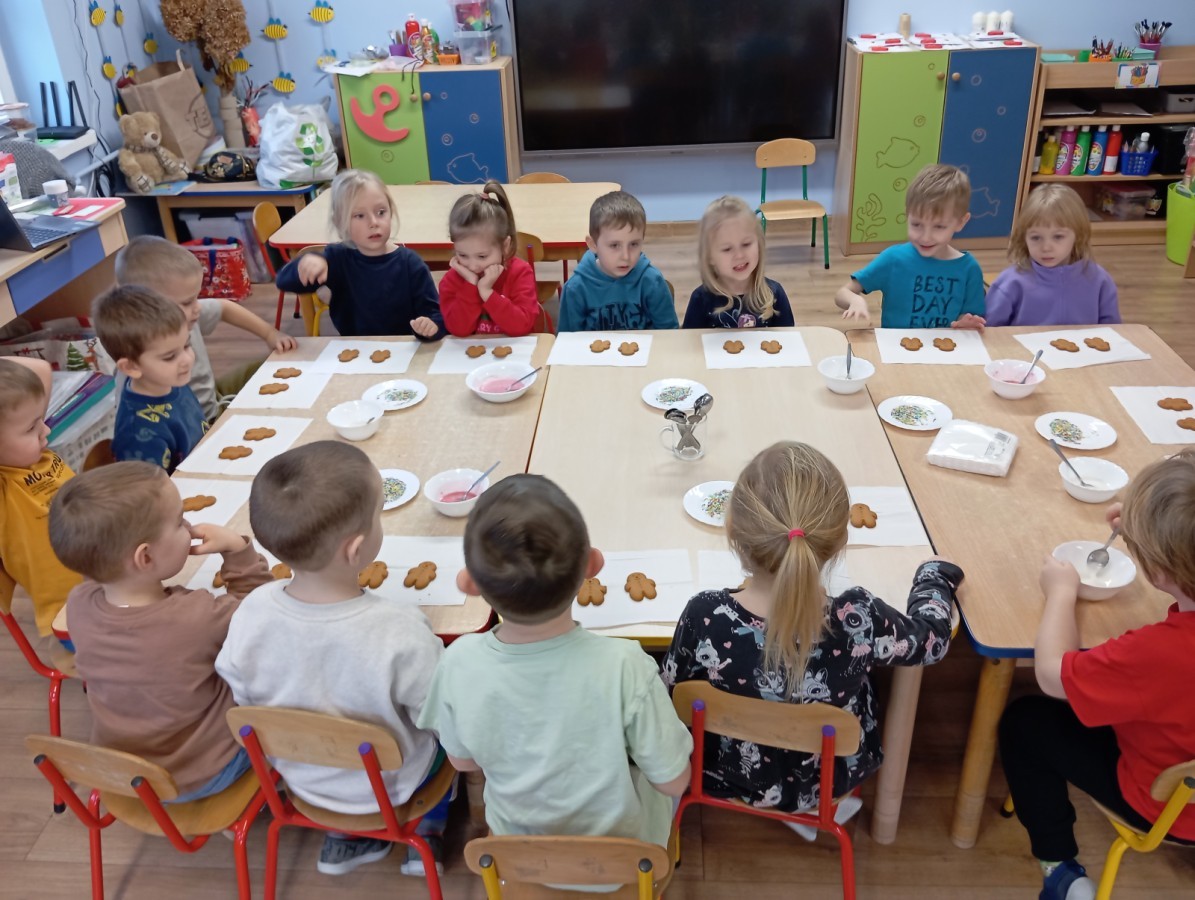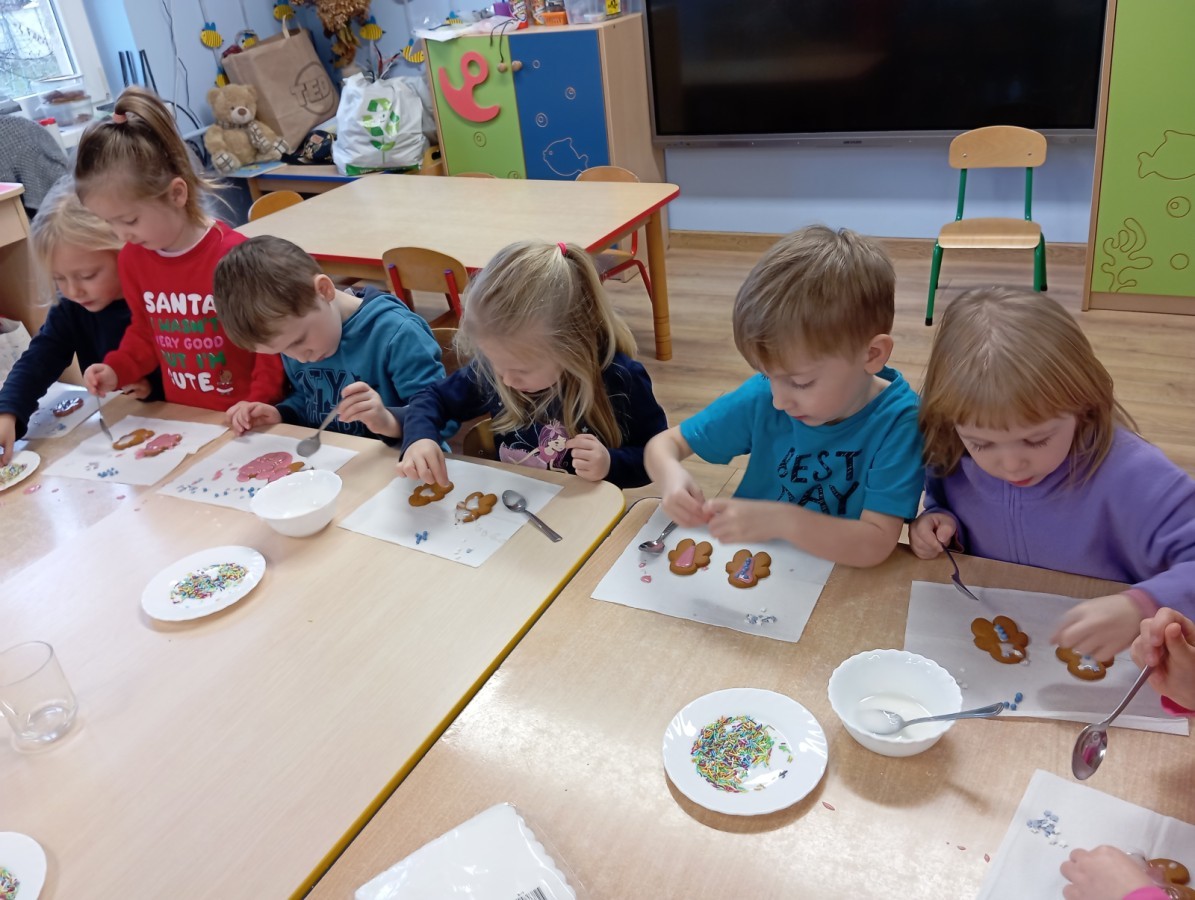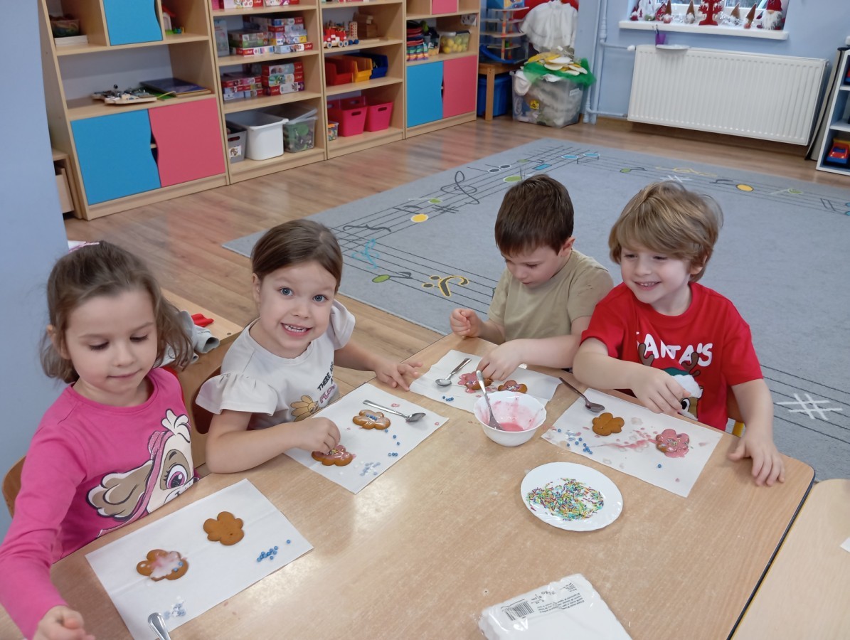 Grupa Pracowite Pszczółki z radością przygotowywała się do świąt! Przedszkolaki dekorowały pierniki, wcześniej samodzielnie przygotowując kolorowy lukier. Wspólnie ubierały choinkę, a zanim pojawiły się na niej ozdoby – dzieci same złożyły drzewko. Nie zabrakło także pracy plastycznej – Pszczółki wykonały tradycyjny łańcuch choinkowy, ćwicząc przy tym cierpliwość i współpracę. Odwiedziła nas też Pani Monika i przeprowadziła ciekawe warsztaty, na których dzieci wykonały sensoryczne choinki.