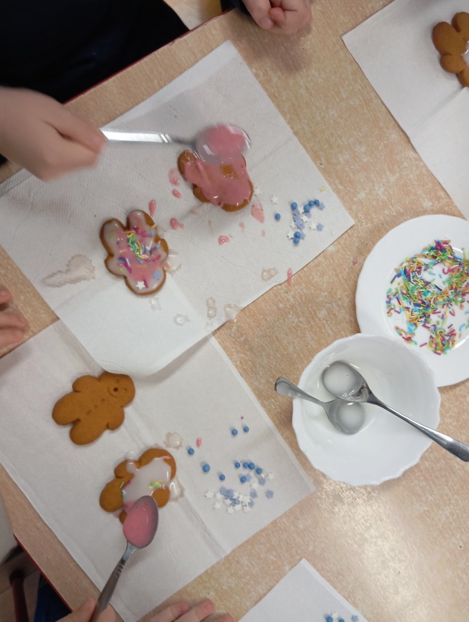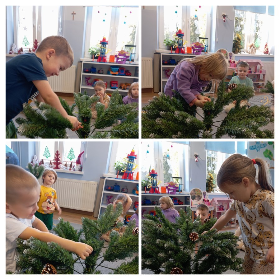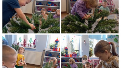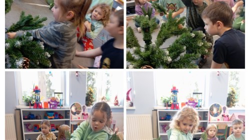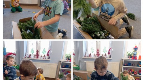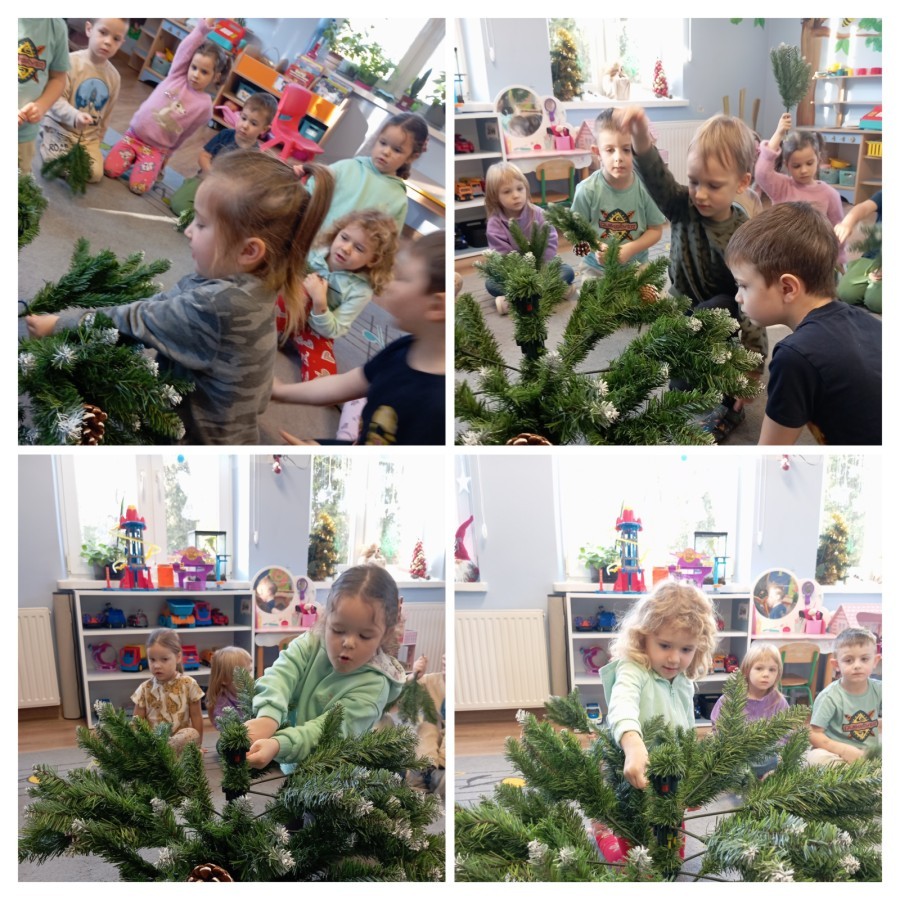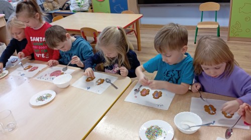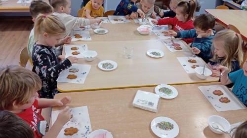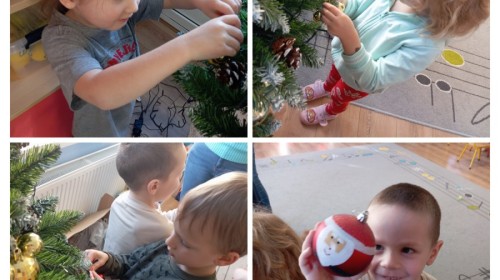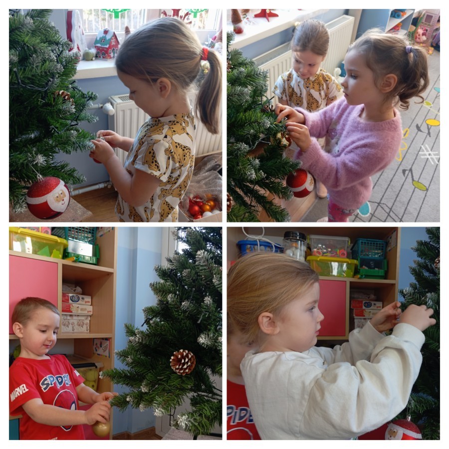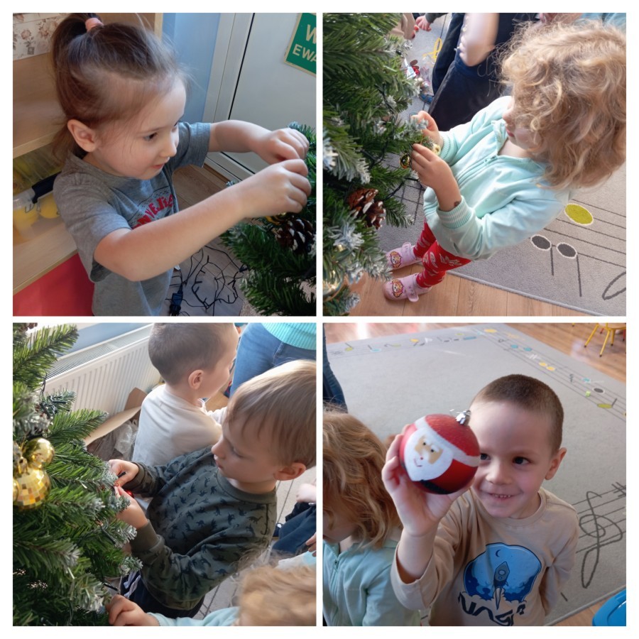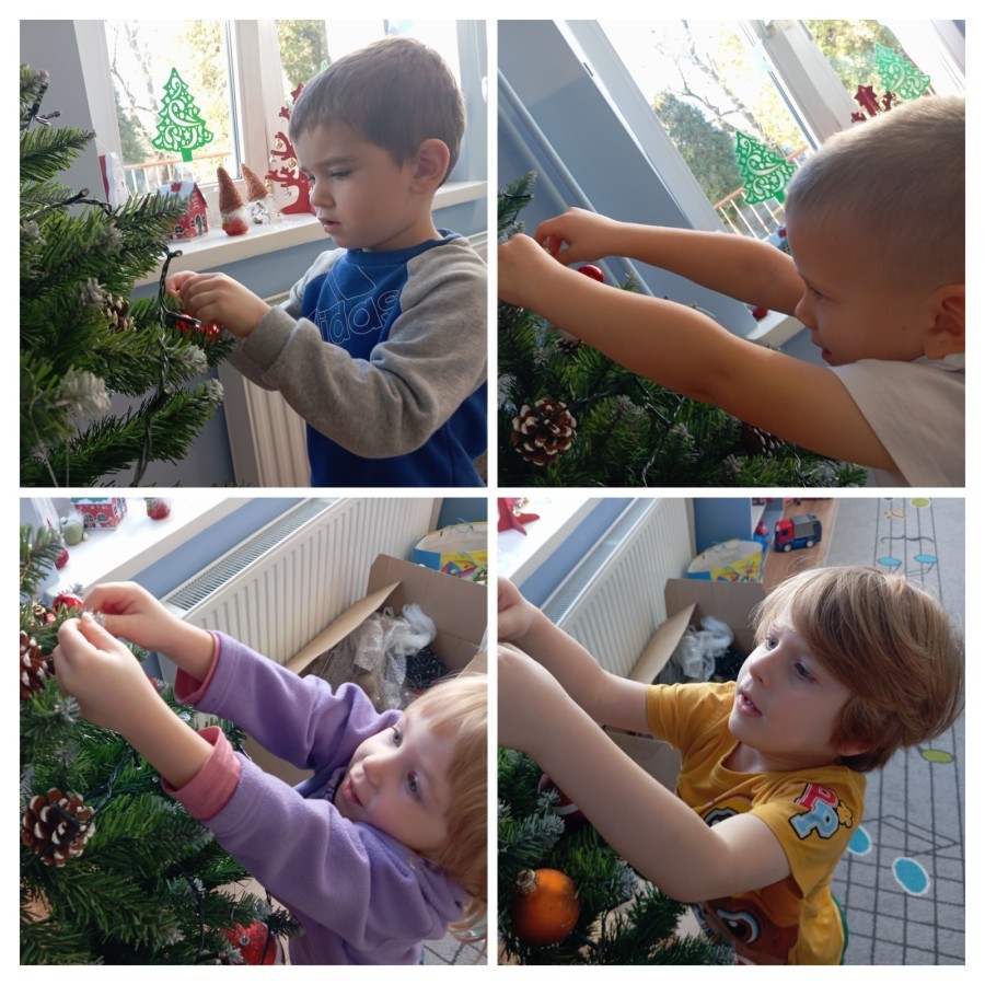 Grupa Pracowite Pszczółki z radością przygotowywała się do świąt! Przedszkolaki dekorowały pierniki, wcześniej samodzielnie przygotowując kolorowy lukier. Wspólnie ubierały choinkę, a zanim pojawiły się na niej ozdoby – dzieci same złożyły drzewko. Nie zabrakło także pracy plastycznej – Pszczółki wykonały tradycyjny łańcuch choinkowy, ćwicząc przy tym cierpliwość i współpracę. Odwiedziła nas też Pani Monika i przeprowadziła ciekawe warsztaty, na których dzieci wykonały sensoryczne choinki.