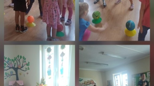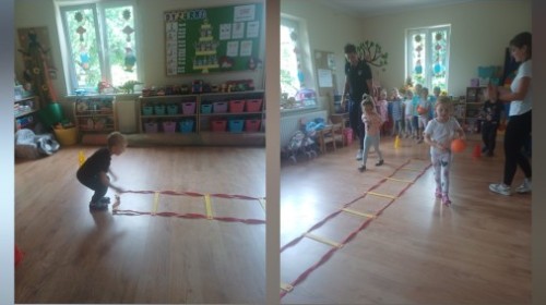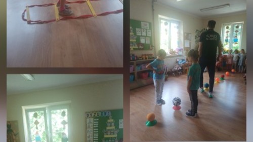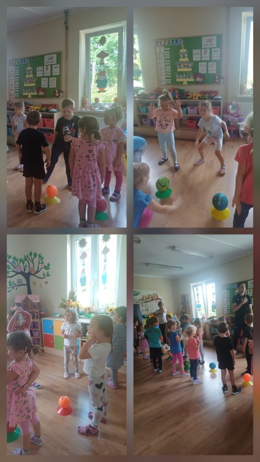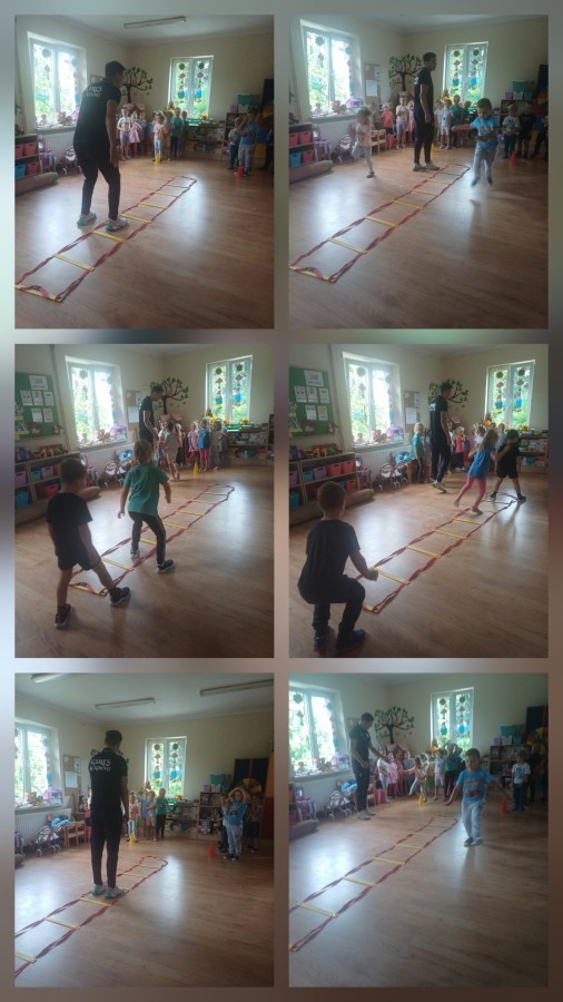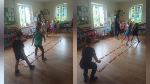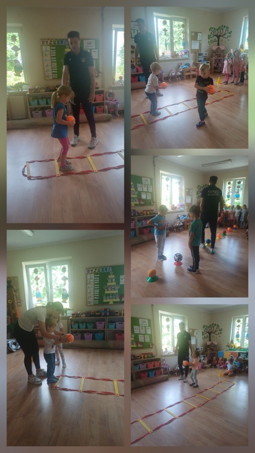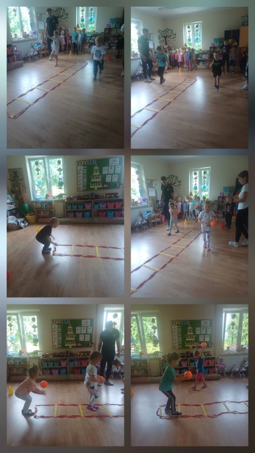 Tego dnia przedszkolaki wzięły udział w zajęciach WF-u realizowanych w ramach projekty unijnego. Podczas ćwiczeń dzieci rozwijały koordynacje wzrokowo-ruchową, doskonaliły zmysł równowagi oraz budowały pozytywne relację z kolegami i koleżankami z grupy. Wszystko pod okiem trenerów pana Kuby o Pani Martyny.