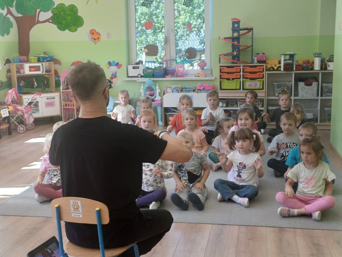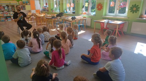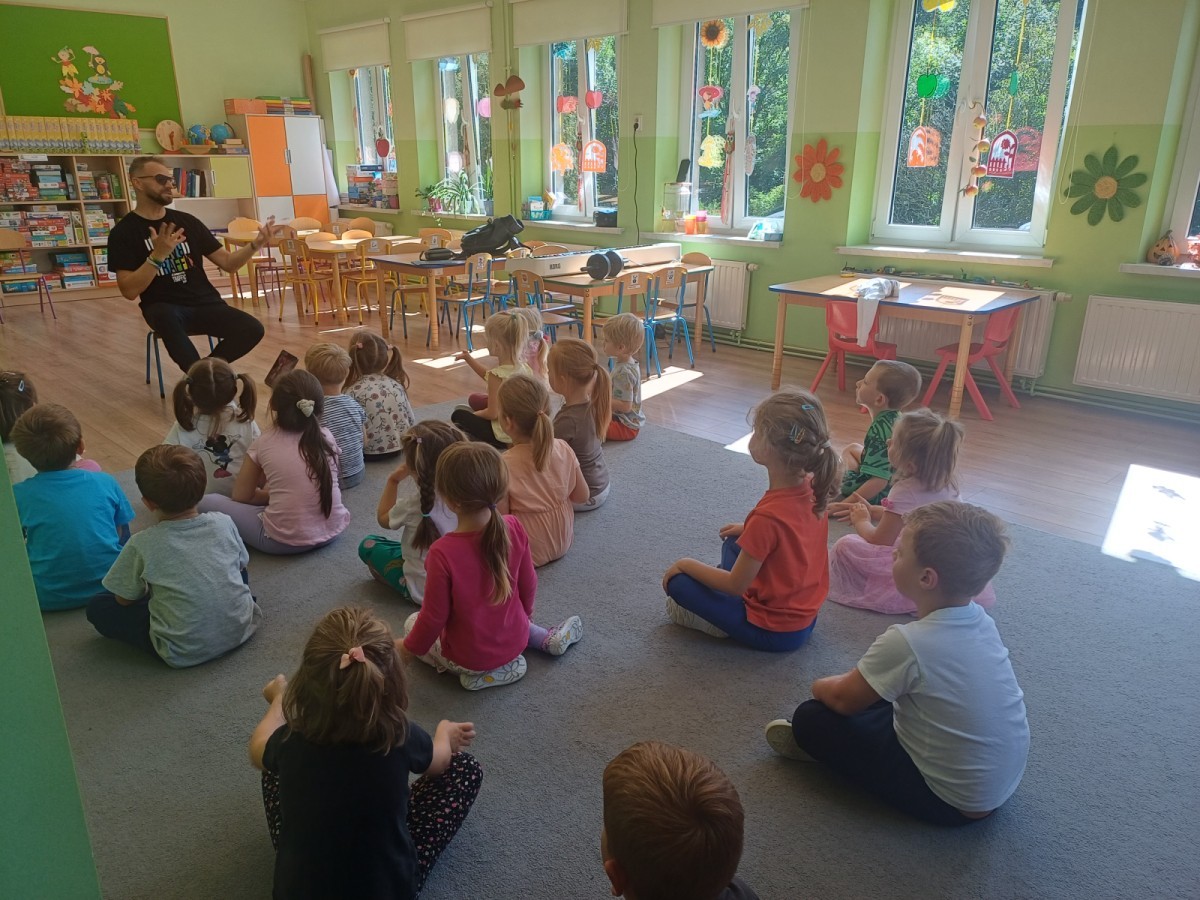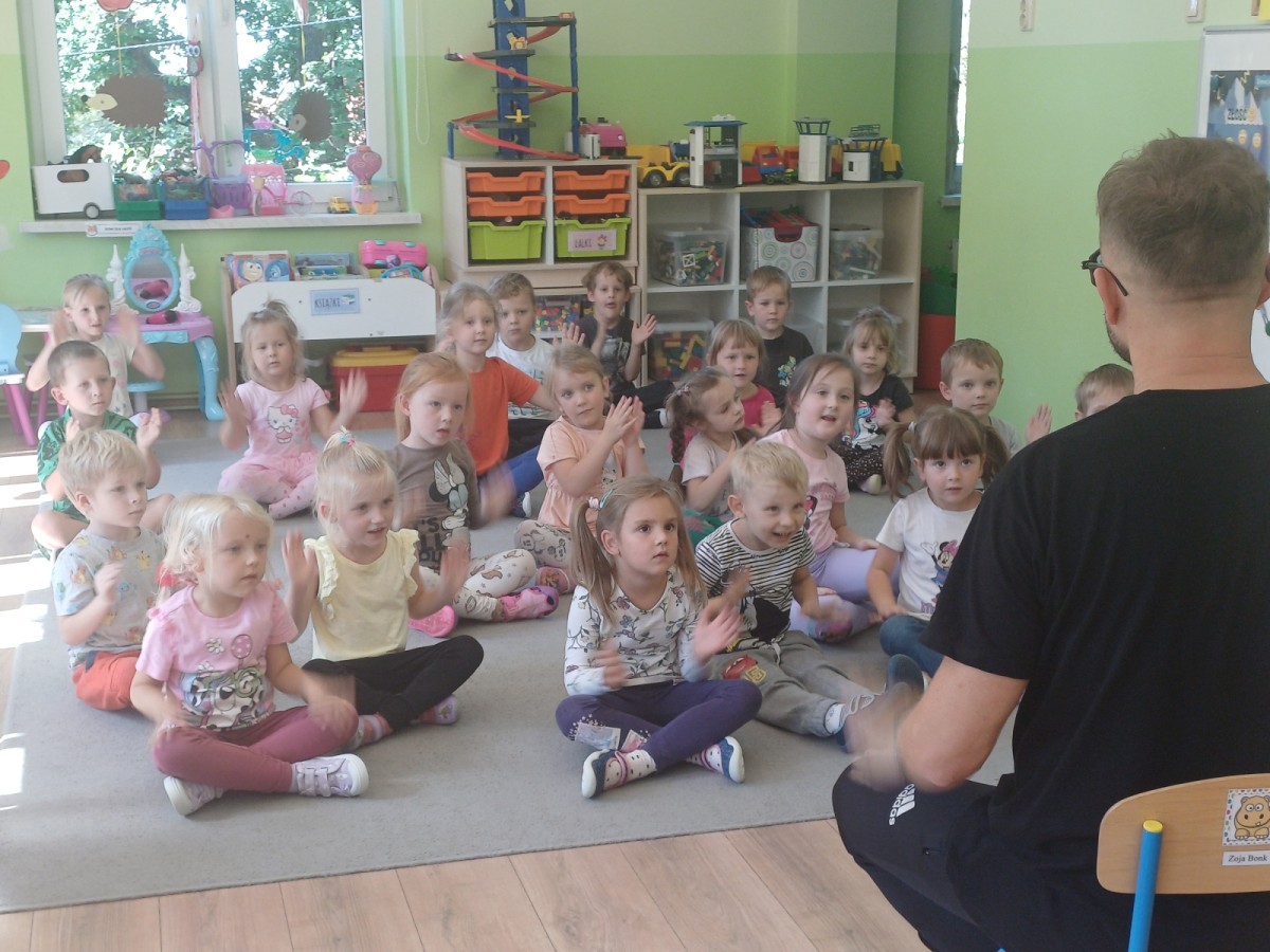 Podczas pierwych zajęć z rytmiki dzieci poznawały się z Panem Sebastianem jak również zapoznały się z zasadami obowiązującymi podczas zajęć. Podczas zabaw do muzyki granej przez Pana dzieci regowały na zmiany tempa, wysokości dźwięków w muzyce, ilustrowały ruchem muzykę. Dzieciom zajecia bardzo się podobały.
