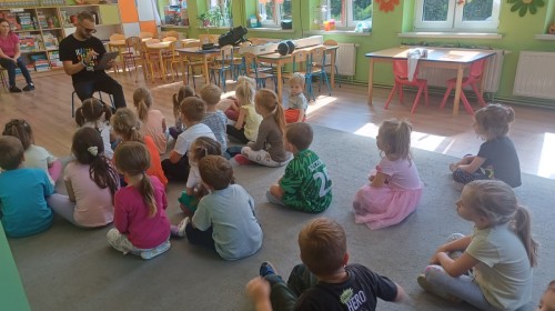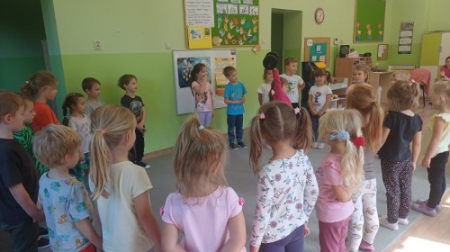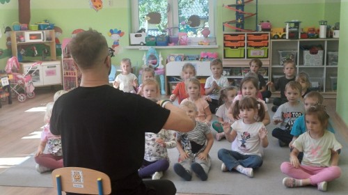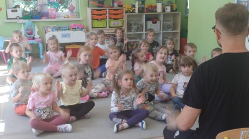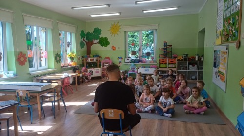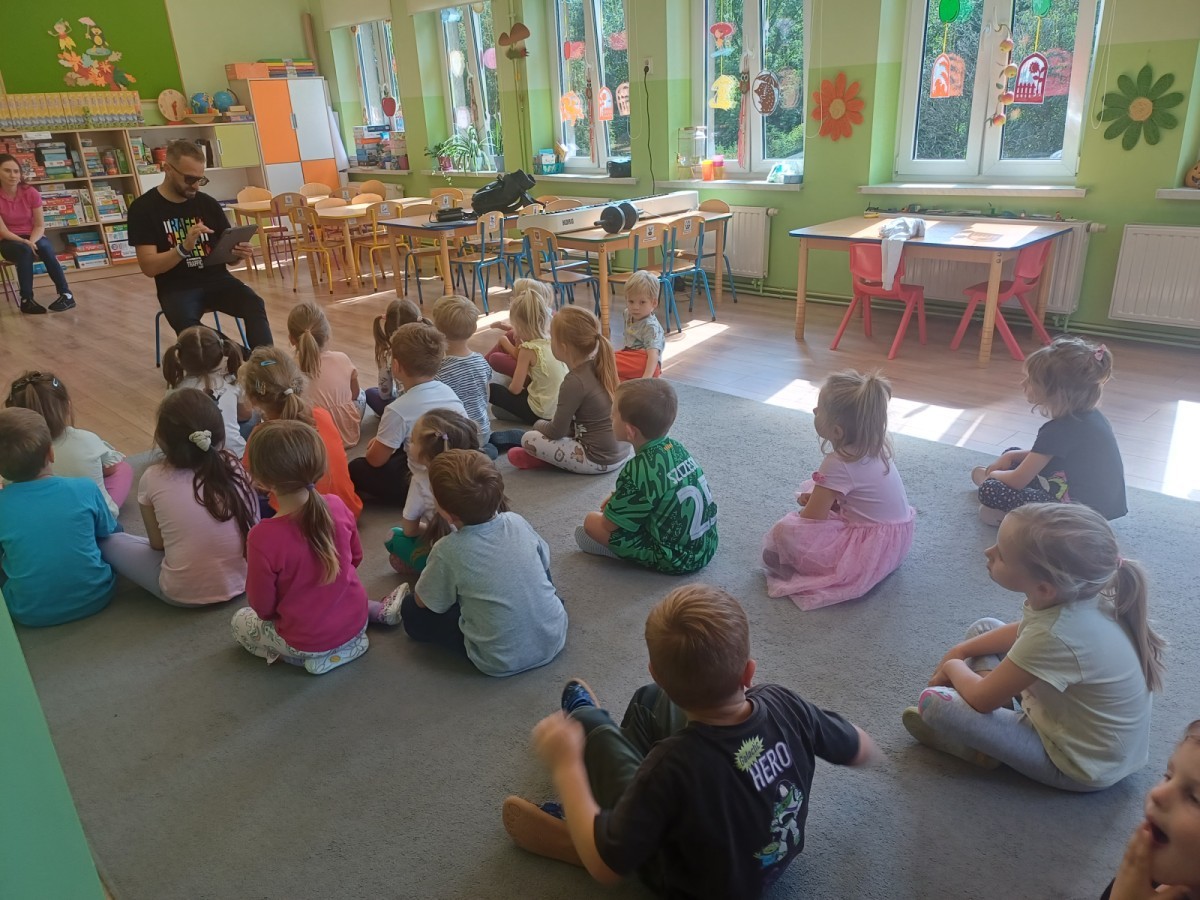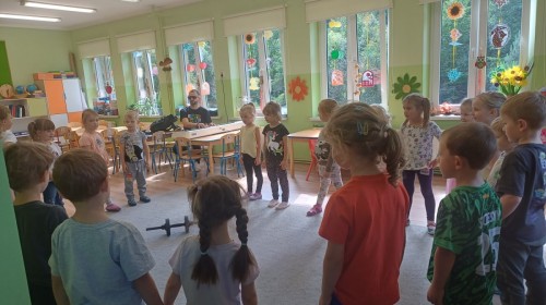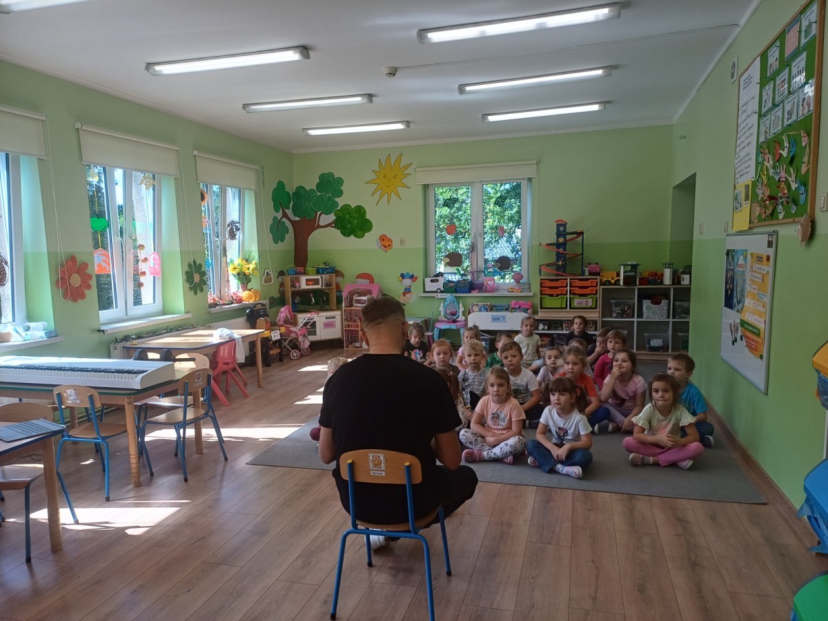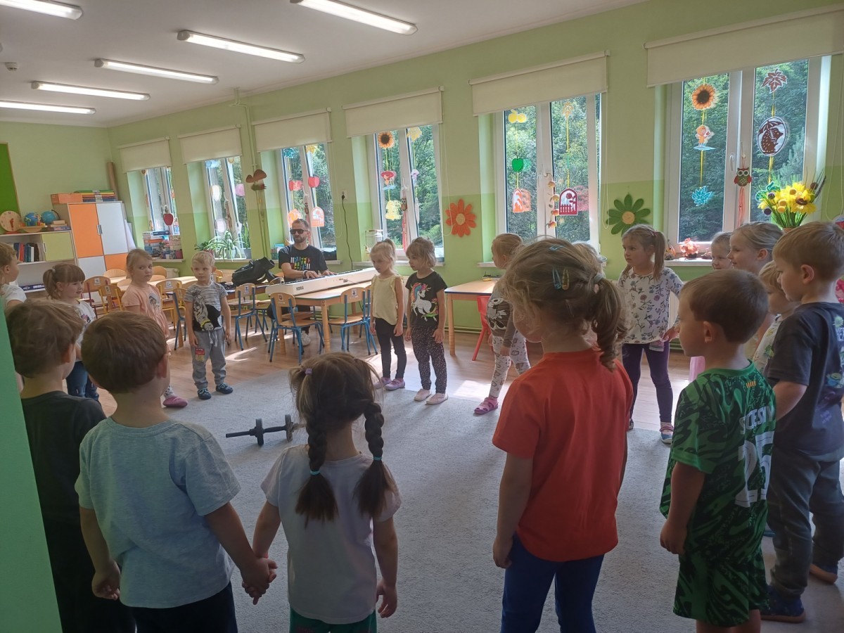 Podczas pierwych zajęć z rytmiki dzieci poznawały się z Panem Sebastianem jak również zapoznały się z zasadami obowiązującymi podczas zajęć. Podczas zabaw do muzyki granej przez Pana dzieci regowały na zmiany tempa, wysokości dźwięków w muzyce, ilustrowały ruchem muzykę. Dzieciom zajecia bardzo się podobały.