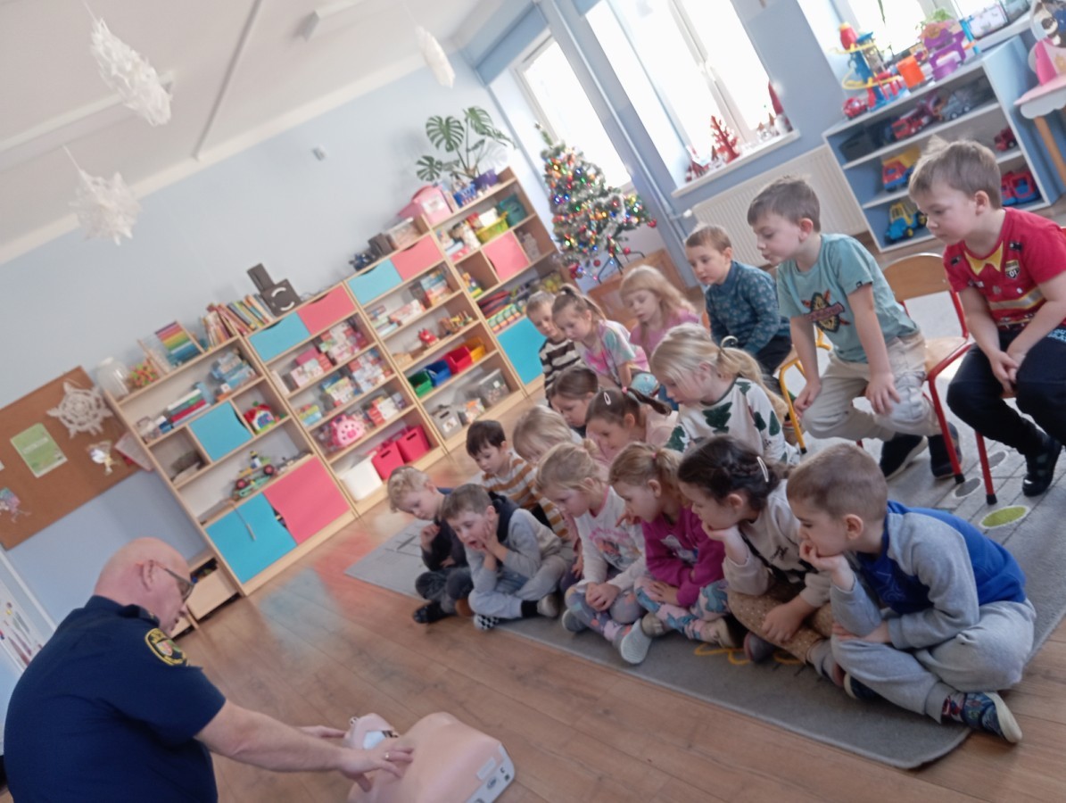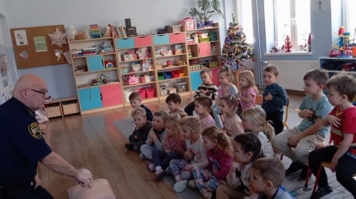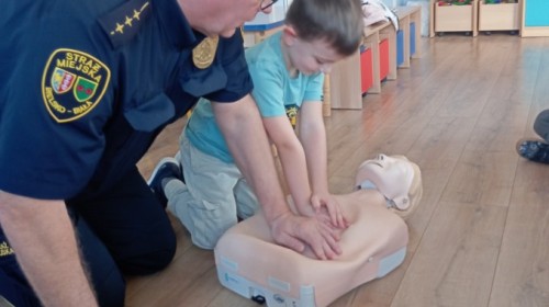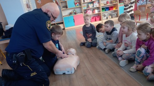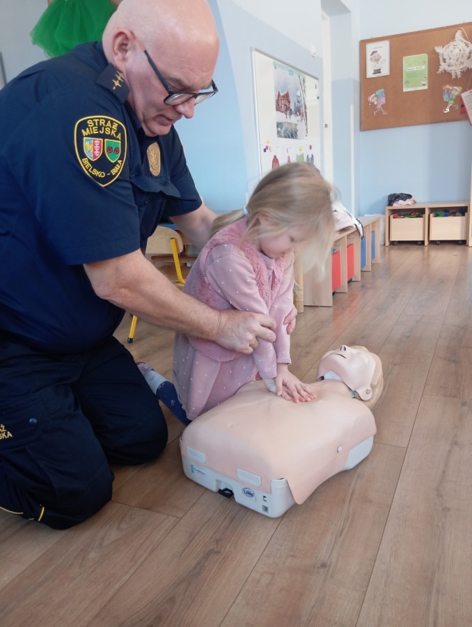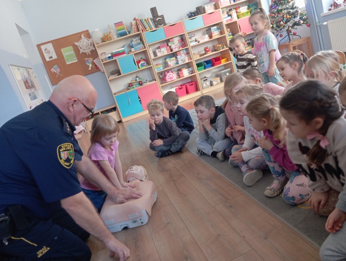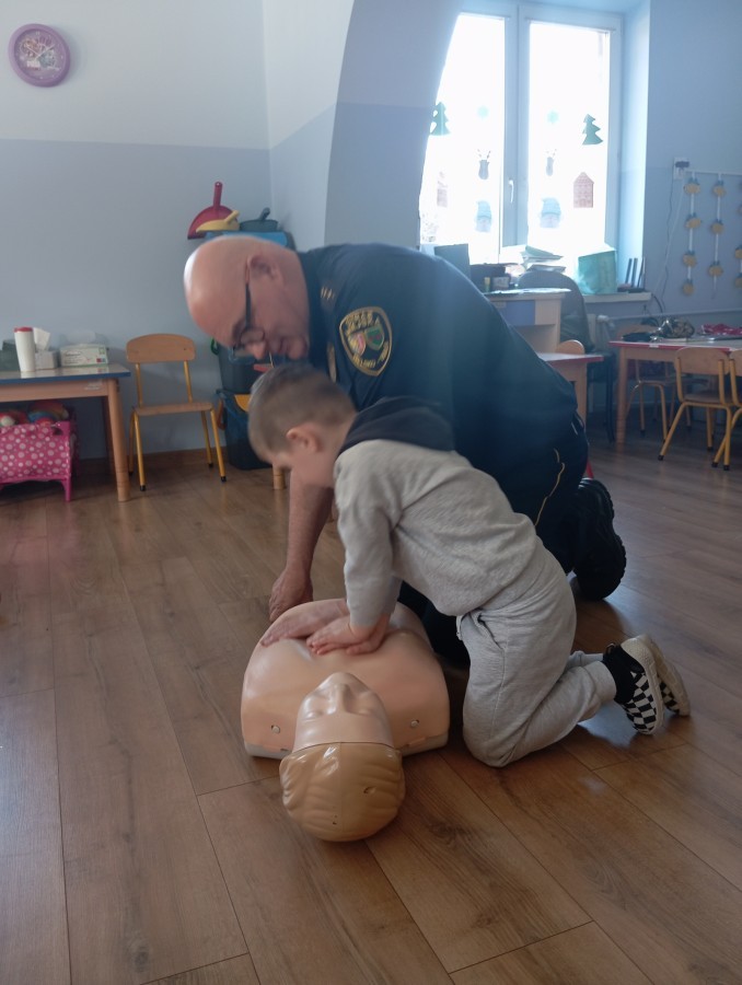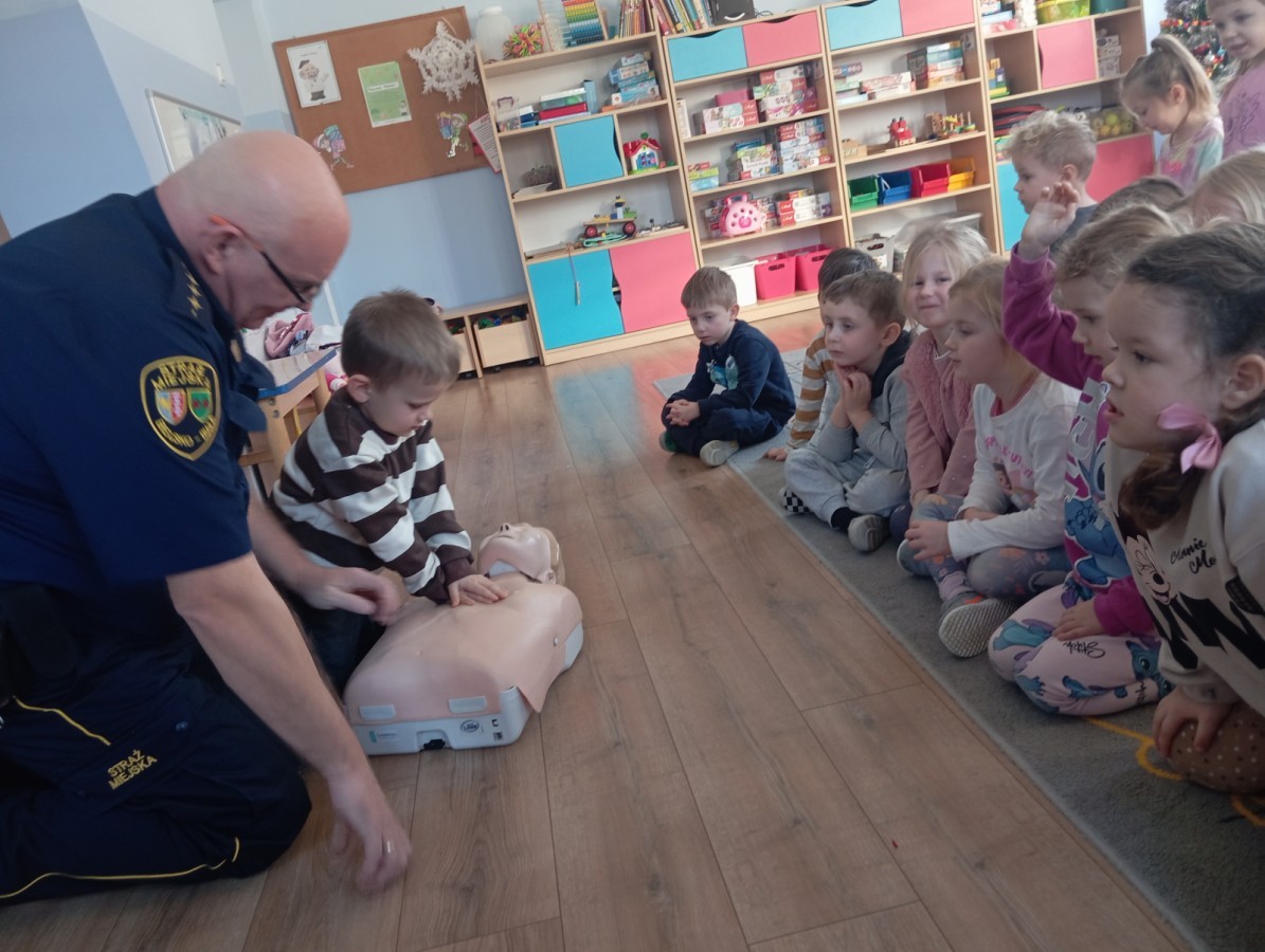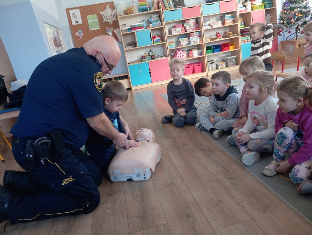 W poniedziałek odwiedził nas zaprzyjaźniony Strażnik Miejski, pan Mirek, który przybliżył przedszkolakom bardzo ważny, choć trudny temat – pierwszą pomoc. Spotkanie rozpoczęło się od obejrzenia krótkiego filmu edukacyjnego. Następnie pan Mirek przypomniał podstawowe zasady udzielania pierwszej pomocy oraz zaprezentował, jak prawidłowo wykonuje się masaż serca. Na zakończenie chętne przedszkolaki mogły spróbować swoich sił i przećwiczyć zdobyte umiejętności pod czujnym okiem naszego gościa.