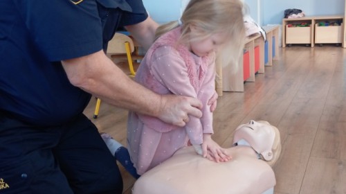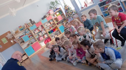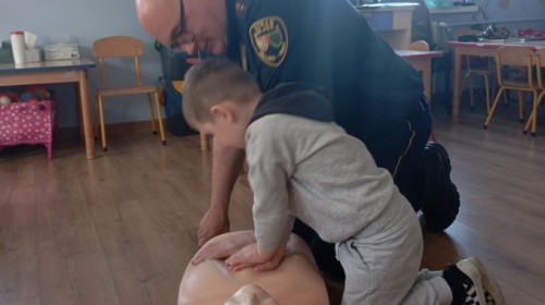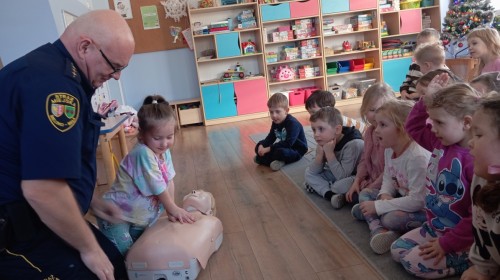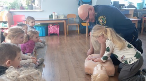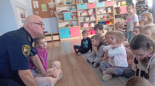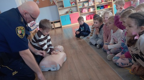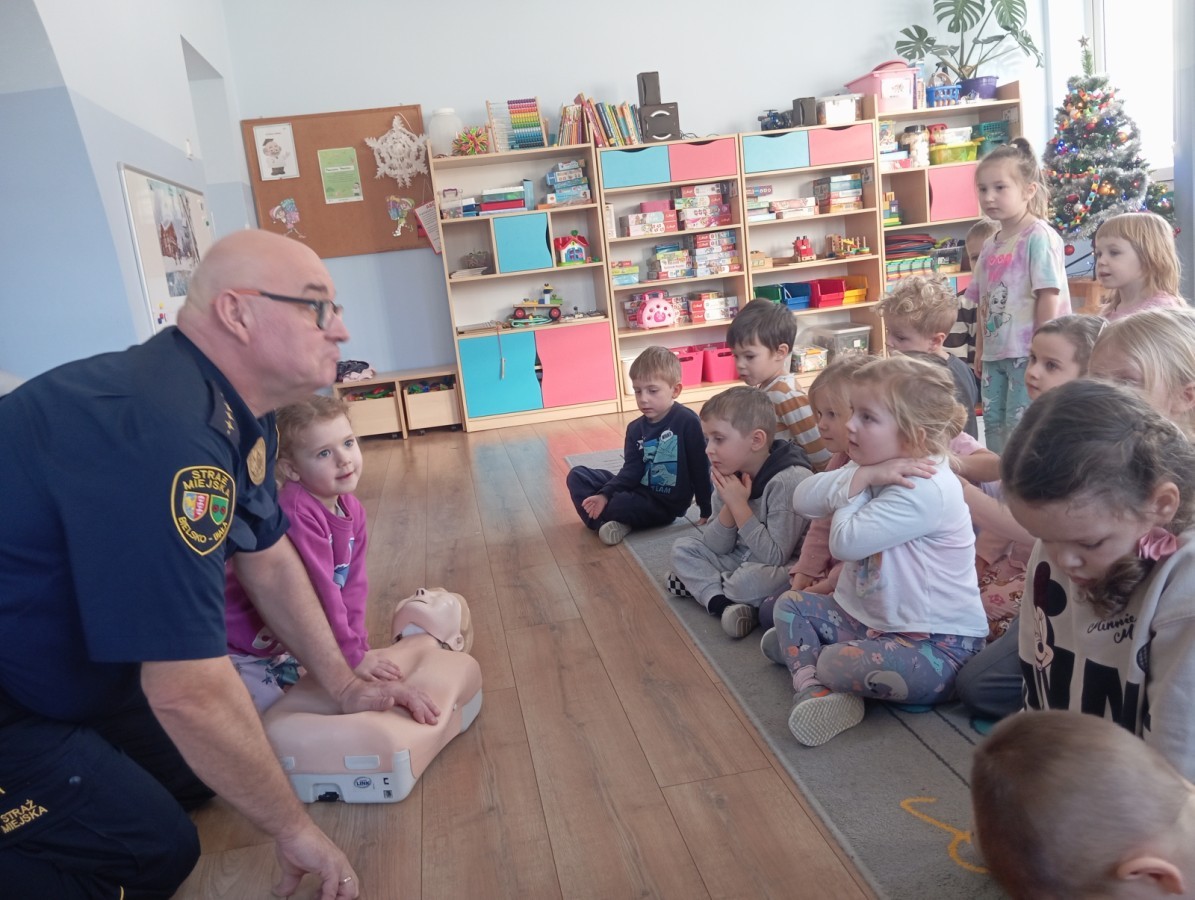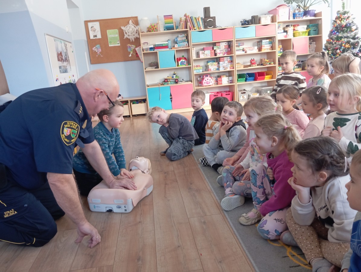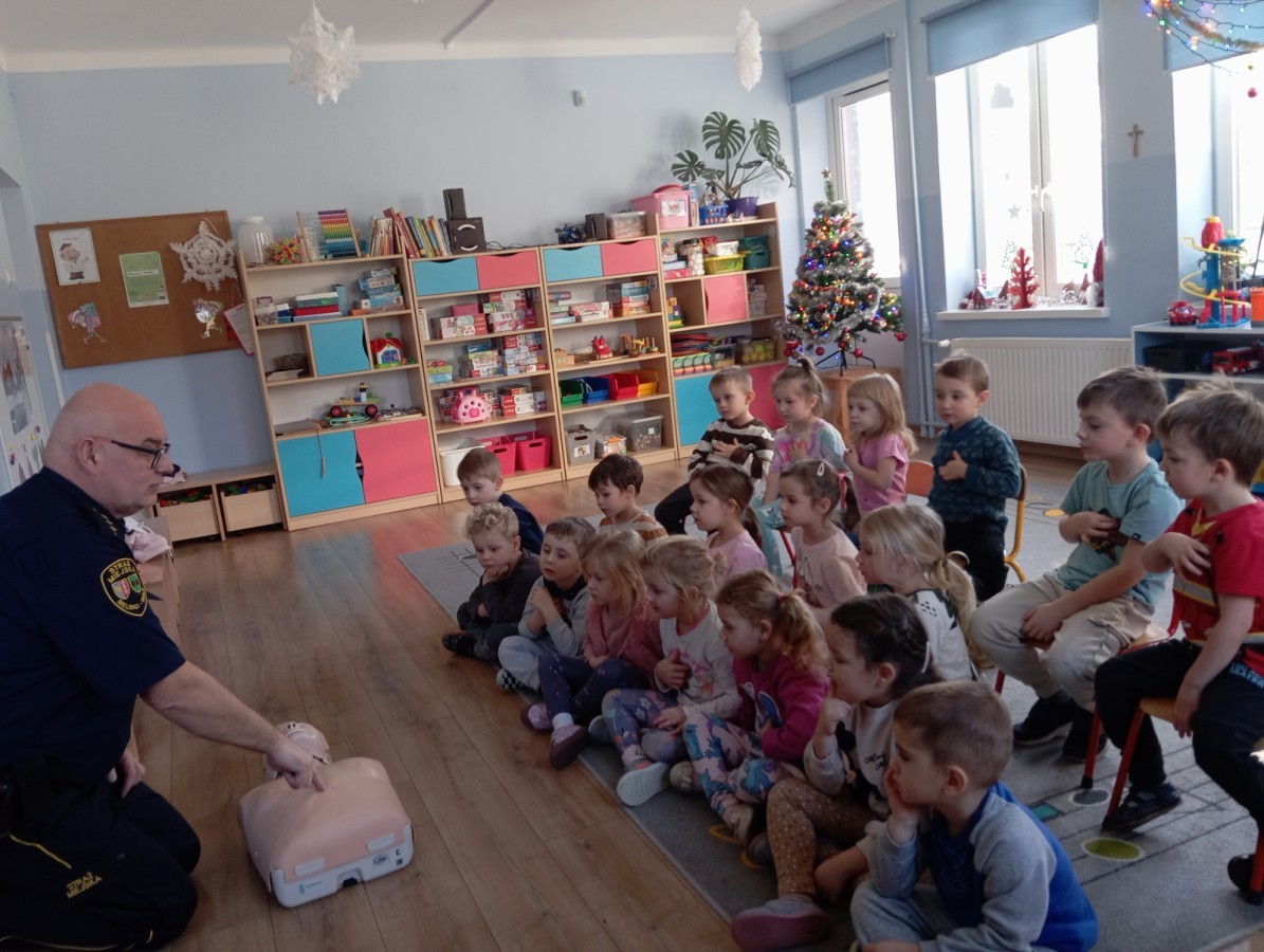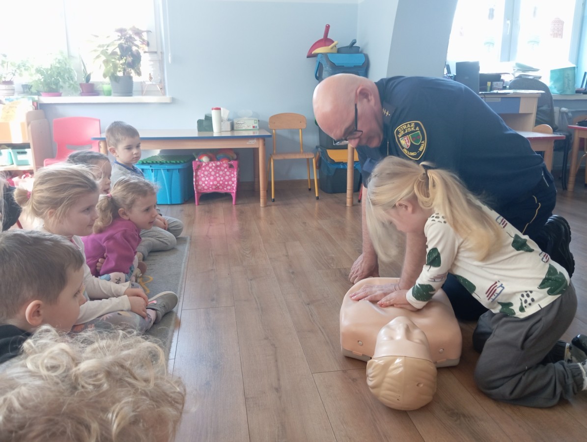 W poniedziałek odwiedził nas zaprzyjaźniony Strażnik Miejski, pan Mirek, który przybliżył przedszkolakom bardzo ważny, choć trudny temat – pierwszą pomoc. Spotkanie rozpoczęło się od obejrzenia krótkiego filmu edukacyjnego. Następnie pan Mirek przypomniał podstawowe zasady udzielania pierwszej pomocy oraz zaprezentował, jak prawidłowo wykonuje się masaż serca. Na zakończenie chętne przedszkolaki mogły spróbować swoich sił i przećwiczyć zdobyte umiejętności pod czujnym okiem naszego gościa.