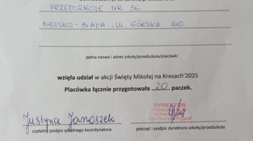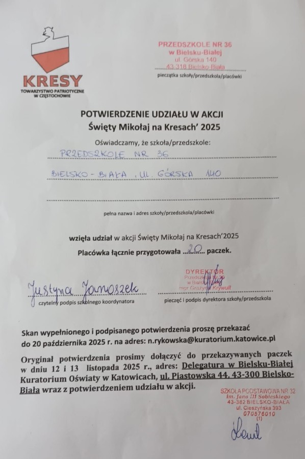 Towarzystwo Patriotyczne „Kresy” jak co roku przystąpiło do organizacji corocznej akcji mikołajkowej dla dzieci „Święty Mikołaj na Kresach 2025”. Oczywiście nasze Przedszkole dołożyło swoją cegiełkę, organizując zbiórkę. W tym roku udało nam się przekazać 20 paczek, za co serdecznie dziękujemy wszystkim którzy włączyli się do tej akcji.