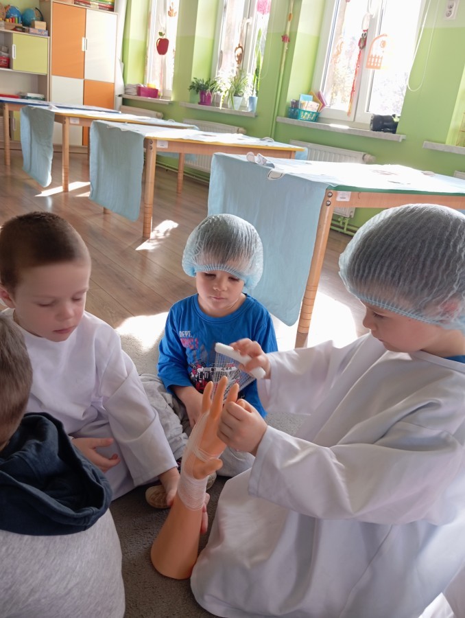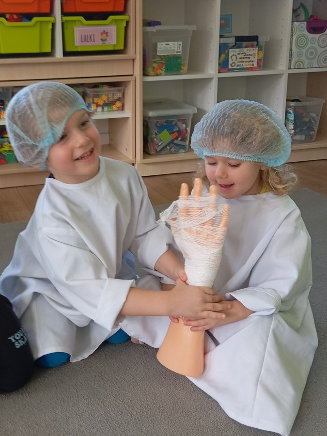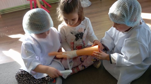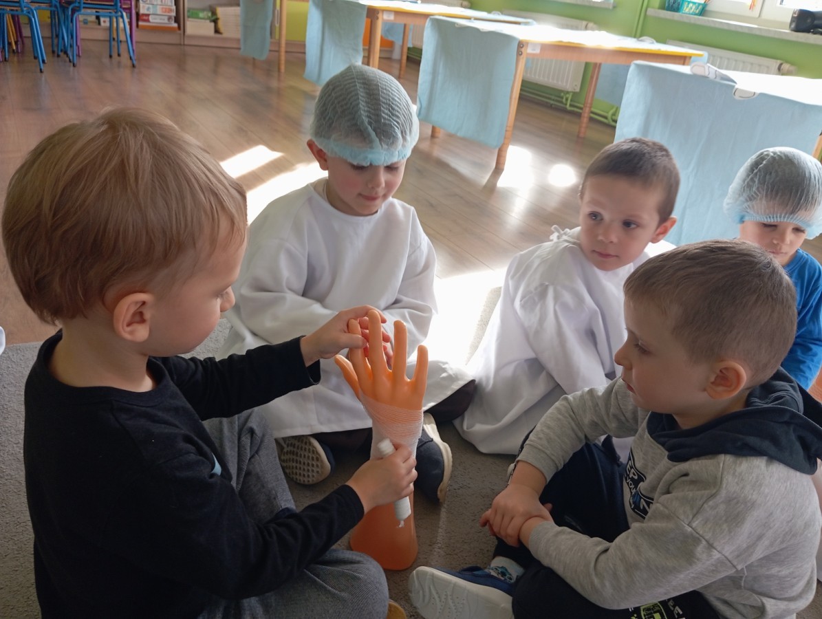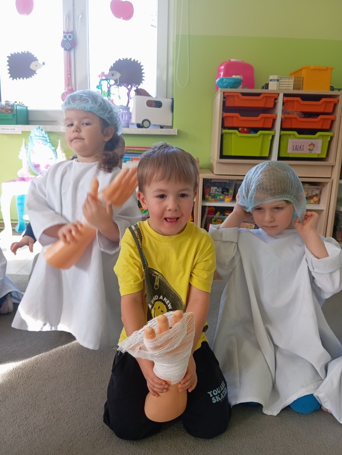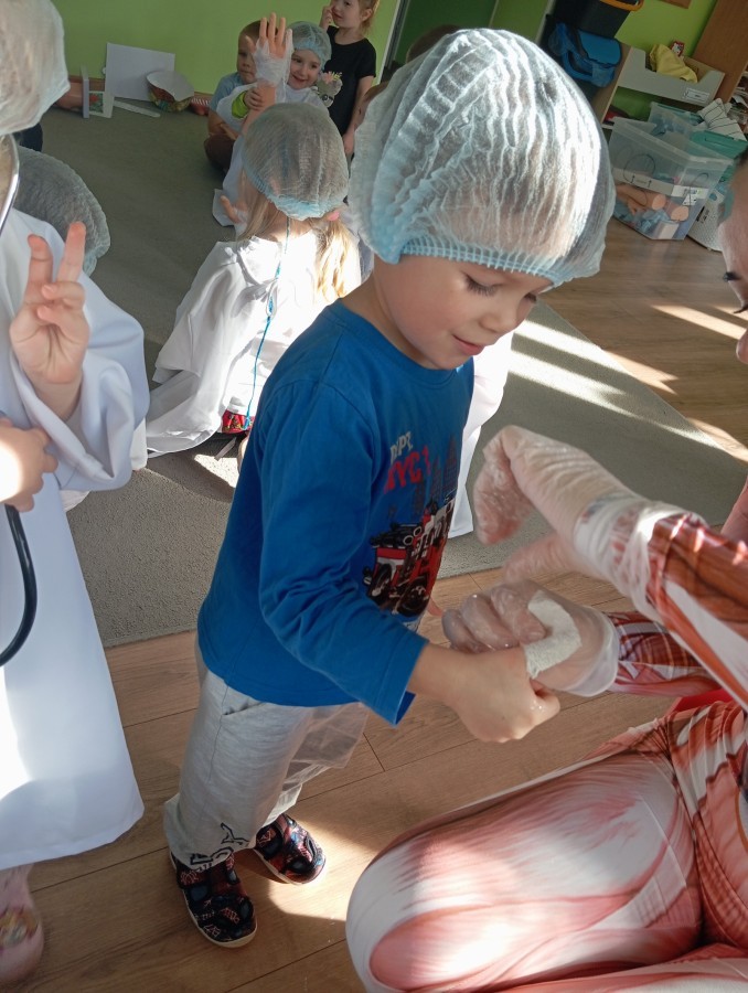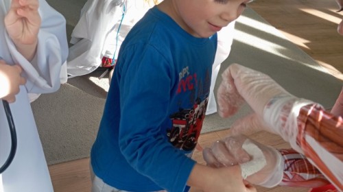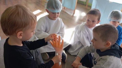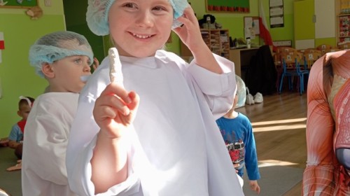 Cóż to były za warsztaty! Jak na chirurgów przystało zajęcia rozpoczęliśmy od ubrania się w kaftany i czepki chirurgiczne i tak przygotowani mogliśmy rozpocząć edukację. Najpierw część teoretyczna, bez wiedzy nie można zacząć operacji. Panie prowadzące pokazały nam jak zbudowane jest nasze ciało, zęby, jak działa mózg a nawet jak wygląda krew! Następnie, aby utrwalić tą wiedzę, Przedszkolaki układały części ciała "pacjentów". Kolejna część to umiejętność opatrywania ran. Pani Ania była bardzo dumna, z tego, jak świetnie współpracujemy w małych zespołach! Na koniec każdy chętny Przedszkolak mógł dać sobie zagipsować palec :) To był bardzo pouczający dzień pełen emocji.