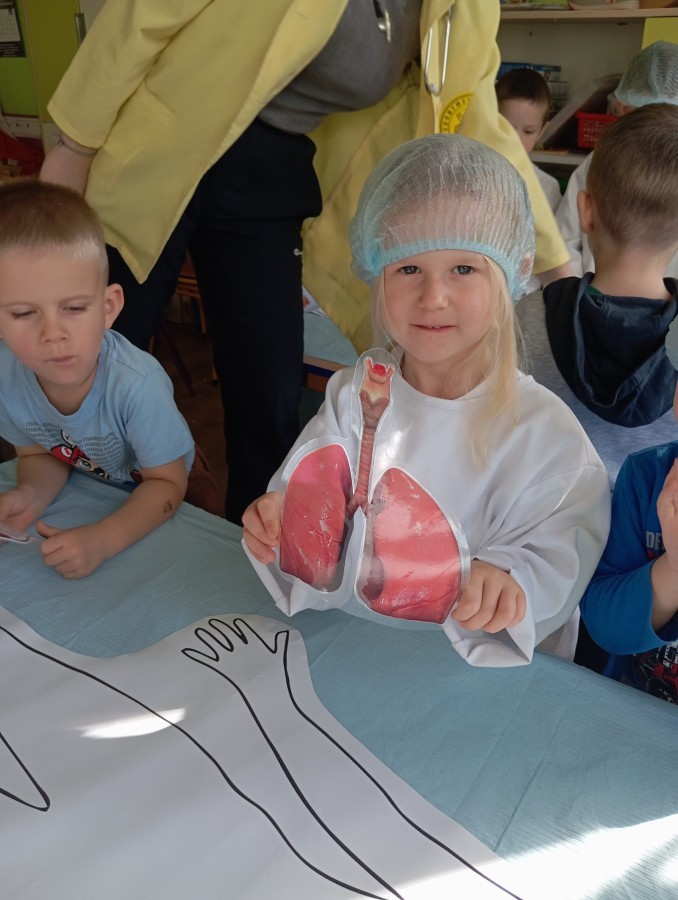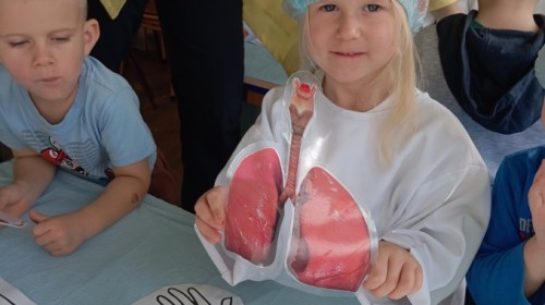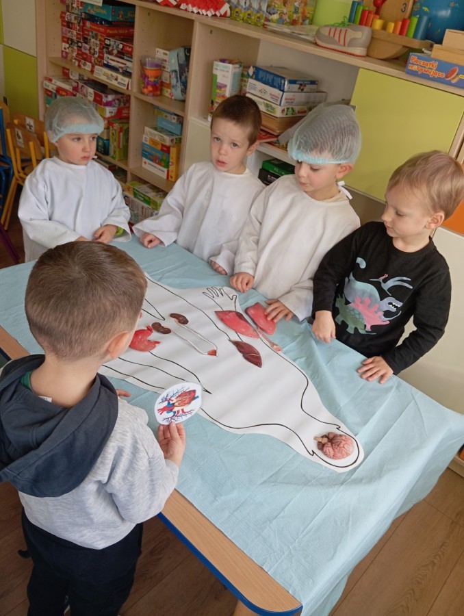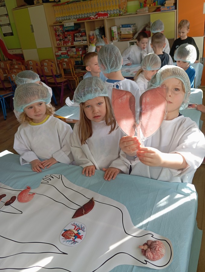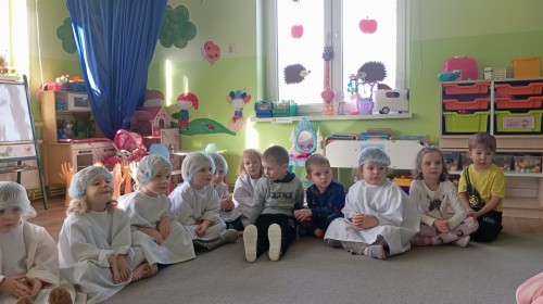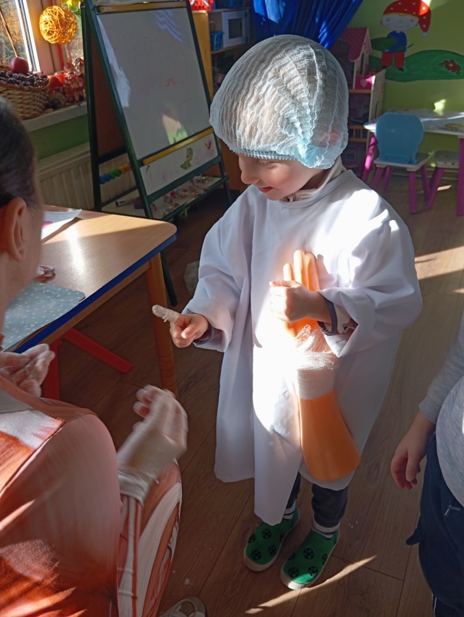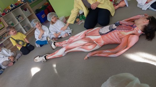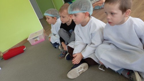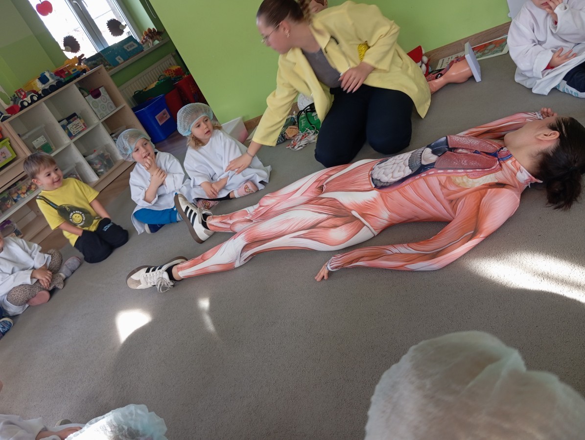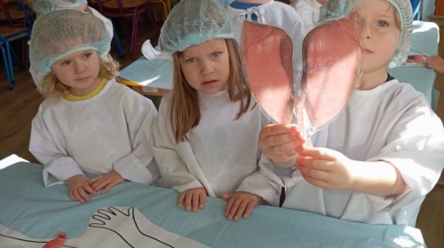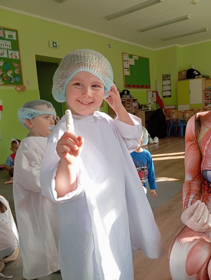 Cóż to były za warsztaty! Jak na chirurgów przystało zajęcia rozpoczęliśmy od ubrania się w kaftany i czepki chirurgiczne i tak przygotowani mogliśmy rozpocząć edukację. Najpierw część teoretyczna, bez wiedzy nie można zacząć operacji. Panie prowadzące pokazały nam jak zbudowane jest nasze ciało, zęby, jak działa mózg a nawet jak wygląda krew! Następnie, aby utrwalić tą wiedzę, Przedszkolaki układały części ciała "pacjentów". Kolejna część to umiejętność opatrywania ran. Pani Ania była bardzo dumna, z tego, jak świetnie współpracujemy w małych zespołach! Na koniec każdy chętny Przedszkolak mógł dać sobie zagipsować palec :) To był bardzo pouczający dzień pełen emocji.