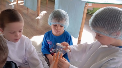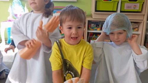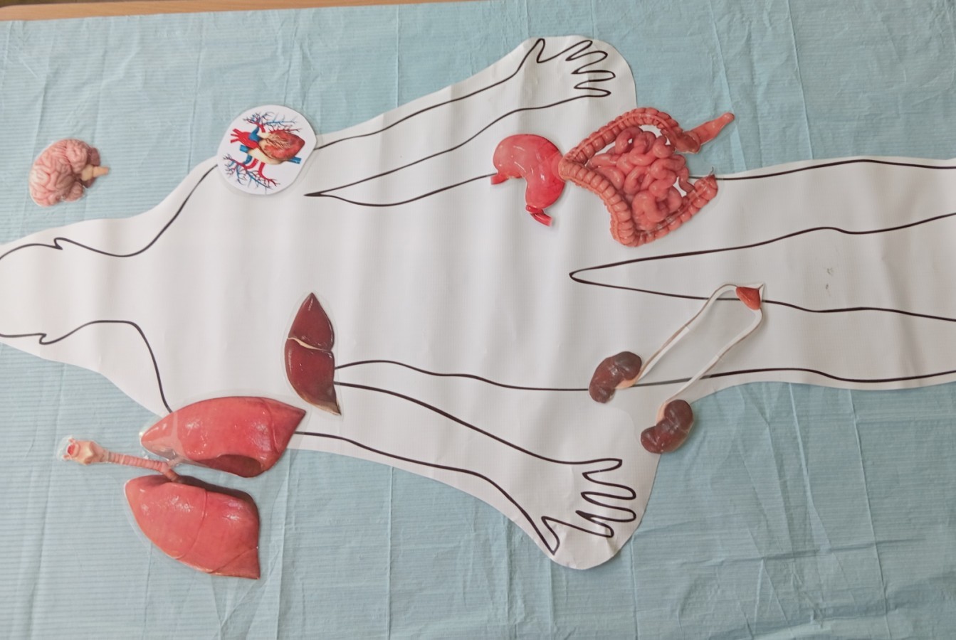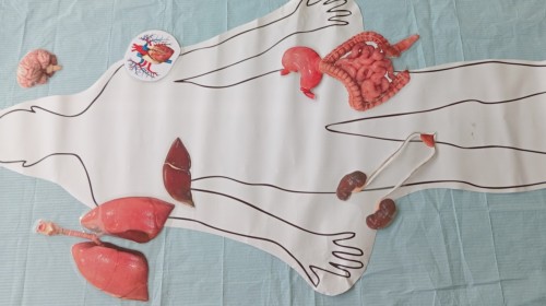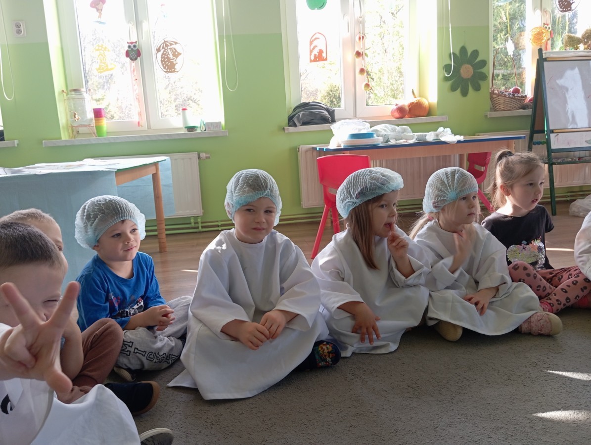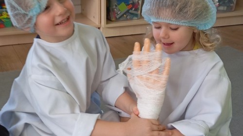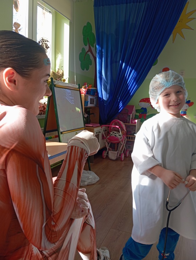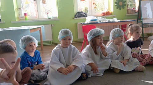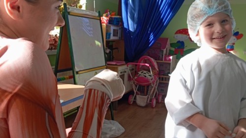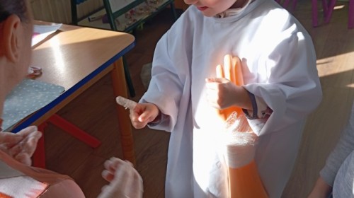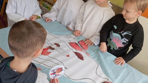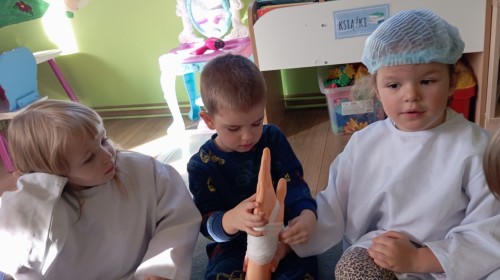 Cóż to były za warsztaty! Jak na chirurgów przystało zajęcia rozpoczęliśmy od ubrania się w kaftany i czepki chirurgiczne i tak przygotowani mogliśmy rozpocząć edukację. Najpierw część teoretyczna, bez wiedzy nie można zacząć operacji. Panie prowadzące pokazały nam jak zbudowane jest nasze ciało, zęby, jak działa mózg a nawet jak wygląda krew! Następnie, aby utrwalić tą wiedzę, Przedszkolaki układały części ciała "pacjentów". Kolejna część to umiejętność opatrywania ran. Pani Ania była bardzo dumna, z tego, jak świetnie współpracujemy w małych zespołach! Na koniec każdy chętny Przedszkolak mógł dać sobie zagipsować palec :) To był bardzo pouczający dzień pełen emocji.